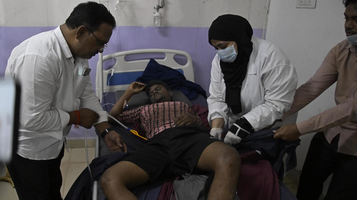 Injured workers receive treatment at a local hospital after a moving crane collapsed at the NCC factory in Mahalingapuram village, Shankarpally mandal, Rangareddy district, left five dead on Monday (April 27, 2026).