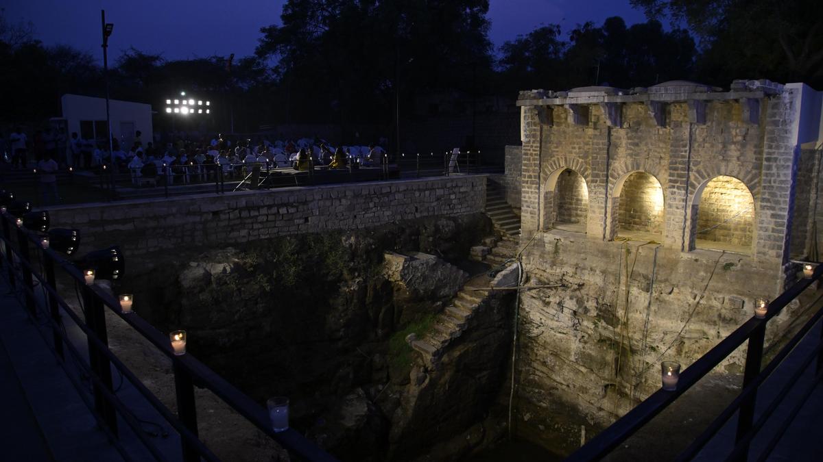 A neglected pit which once held nearly 3,000 tonnes of garbage, now stood illuminated, its stone geometry glowing against the night. This was a 300-year-old stepwell in Adikmet, now revived, offering a glimpse into Hyderabad’s layered water heritage. The lighting, carefully designed to highlight the stepwell’s contours, gave it a theatrical presence.
