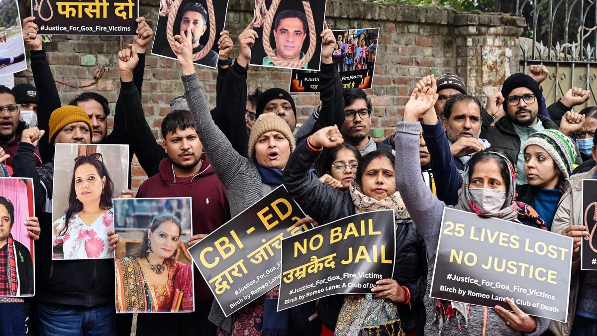 Family members of Goa fire victims stage a protest at Jantar Mantar, in New Delhi on January 4, 2026. | Photo Credit: ANI Families of the victims of the Goa nightclub fire held a protest at Delhi’s Jantar Mantar on Sunday (January 4, 2026), demanding a death sentence for the owners of the club where the tragedy occurred. Raising slogans such as “hang the killers”, the protesters named brothers Saurabh Luthra and Gaurav Luthra, holding them responsible for the blaze that claimed 25 lives. The families said that justice must be delivered for those who died and those who were injured in the incident. The fire broke out on December 6, last year, at Birch by Romeo Lane, a nightclub in Goa’s Arpora village, when it was hosting a dance party. As many as 50 people were injured in the incident. The two brothers fled the country hours after the incident and travelled to Thailand. They were later deported back to India on December 17 and are currently in the custody of the Goa police. Published – January 04, 2026 08:14 pm IST Share this: Click to share on WhatsApp (Opens in new window) WhatsApp Click to share on Facebook (Opens in new window) Facebook Click to share on Threads (Opens in new window) Threads Click to share on X (Opens in new window) X Click to share on Telegram (Opens in new window) Telegram Click to share on LinkedIn (Opens in new window) LinkedIn Click to share on Pinterest (Opens in new window) Pinterest Click to email a link to a friend (Opens in new window) Email More Click to print (Opens in new window) Print Click to share on Reddit (Opens in new window) Reddit Click to share on Tumblr (Opens in new window) Tumblr Click to share on Pocket (Opens in new window) Pocket Click to share on Mastodon (Opens in new window) Mastodon Click to share on Nextdoor (Opens in new window) Nextdoor Click to share on Bluesky (Opens in new window) Bluesky Like this:Like Loading... Post navigation Ankita murder case: Opposition parties protest, demand CBI probe as police rules out ‘VIP’ angle Energy Minister to inaugurate 132/33 kV substation at Gannavaram Airport on January 5