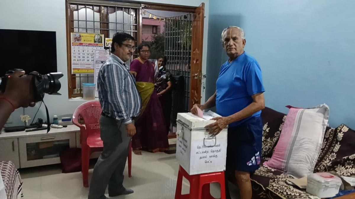 V. Santhanam with polling officials at his home in Chromepet They want to fulfill their duty. And they want to fulfill it from the safety of their home due to their fragile health and advanced age. Voting for senior citizens above 85 years and for voters with disabilities that have expressed preference to vote from home commenced in all 16 Assembly constituencies in Chennai on April 16. Published – April 18, 2026 10:44 am IST Share this: Click to share on WhatsApp (Opens in new window) WhatsApp Click to share on Facebook (Opens in new window) Facebook Click to share on Threads (Opens in new window) Threads Click to share on X (Opens in new window) X Click to share on Telegram (Opens in new window) Telegram Click to share on LinkedIn (Opens in new window) LinkedIn Click to share on Pinterest (Opens in new window) Pinterest Click to email a link to a friend (Opens in new window) Email More Click to print (Opens in new window) Print Click to share on Reddit (Opens in new window) Reddit Click to share on Tumblr (Opens in new window) Tumblr Click to share on Pocket (Opens in new window) Pocket Click to share on Mastodon (Opens in new window) Mastodon Click to share on Nextdoor (Opens in new window) Nextdoor Click to share on Bluesky (Opens in new window) Bluesky Like this:Like Loading... Post navigation Odisha comes up with compensatory irrigation mechanism for acquisition of irrigated land We know how to bring the debt under control, improve the finances of Tamil Nadu, and implement all the welfare schemes completely, says the AIADMK general secretary