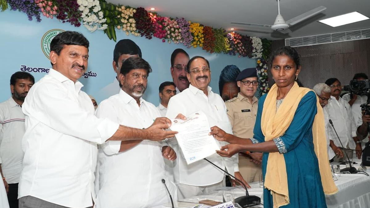 Deputy Chief Minister M. Bhatti Vikramarka handing over house site pattas to eligible poor people among displaced persons of Bhoodan lands at Velugumatla in Khammam on Wednesday.