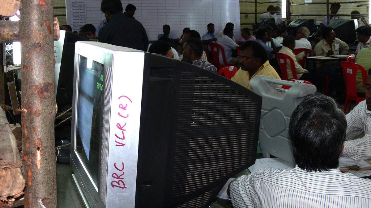 A television set being provided in a vote counting centre for the agents to take down the election results and to monitor the process, in Vellore on May 13, 2001.