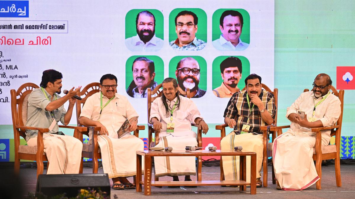 From left: Moderator Nishanth M.V. along with Congress leader K. Muraleedharan, CPI leader Pannian Raveendran, IUML MLA P.K. Basheer, and CMP leader C.P. John during a panel discussion on ‘Humour in politics’ (Rashtriyathile Chiri) at Kerala Legislative International Book Festival at the State Assembly in Thiruvananthapuram on Friday.