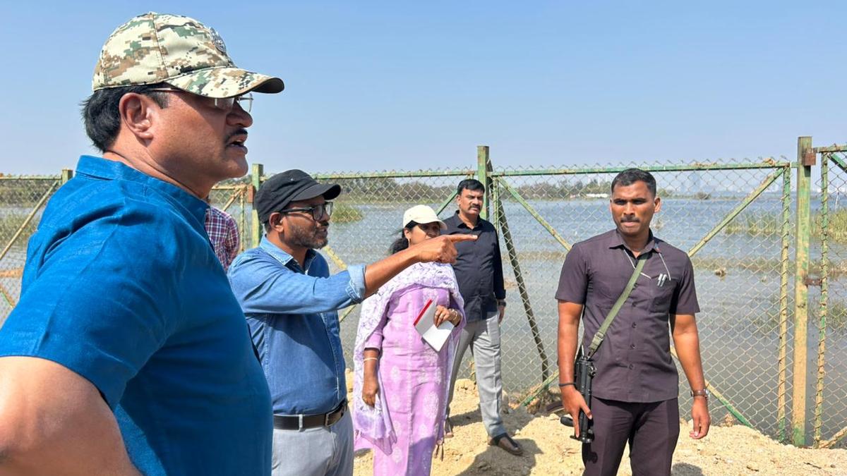 HYDRAA chief A.V. Ranganath inspecting Mella Cheruvu at Tellapur on Saturday.