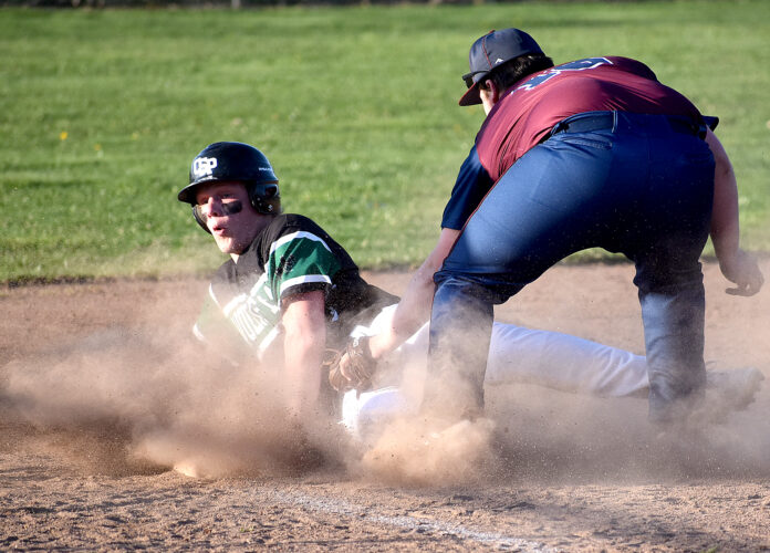 OBSERVER Photo by Matt Spielman Chautauqua Lake’s Ragen Crandall tags out Clymer/Sherman/Panama’s Andrew Spiesman attempting to stretch a double into a triple during Chautauqua-Cattaraugus Athletic Association Division 2 action on Thursday. CLYMER — Andrew Spiesman and Gavin Burchanowski provided the offense while Bryce Hinsdale was effective on the mound as Clymer/Sherman/Panama beat Chautauqua Lake 9-2 in Chautauqua-Cattaraugus Athletic Association Division 2 baseball Thursday evening. The victory was the second in two days for Clymer/Sherman/Panama (2-2, 2-1), which started the season 0-2 while being outscored 17-0 and totaling just four hits against Salamanca and Frewsburg. “I knew once we got into baseball shape, we’d be OK,” said first-year Wolfpack head coach Matt Hair. “Coming out with two great programs like Frewsburg and Salamanca out of the gate … I knew we’d find our rhythm and come around this week.” Chautauqua Lake fell to 2-3 overall and 1-1 in the league, but was just a play or two away from being more competitive in the game. “I thought we played pretty solid defense for the majority of the game,” Chautauqua Lake head coach Matt Cummings said. “We had a couple of bad hiccups that unfortunately were in pretty big moments with runners in scoring position that came back to bite us.” OBSERVER Photo by Matt Spielman Chautauqua Lake’s Devin Hewes safely steals second base under Clymer/Sherman/Panama’s Johnny Abers during Thursday’s CCAA Division 2 game. The Wolfpack jumped on Eagles starter Devin Hewes with a pair of runs in the bottom of the first inning. Burchanowski was hit by a pitch and stole second before a Hinsdale sacrifice bunt sent Burchanowski to third with one out. Tate Catanese followed with an RBI single, went to second on a wild pitch and stole third before Spiesman made it 2-0 with an RBI groundout. The Eagles made it 2-1 in the top of the second inning as a Connor Nowicki RBI single plated Nate Henry with the game’s first run. Hewes walked the Nos. 8 and 9 batters with one out in the second inning, but nearly got out of the inning with a pickoff at second base. He then walked Burchanowski and a double steal put runners at second and third ahead of Hinsdale’s two-run single to left field. Another walk and an intentional walk loaded the bases before Hewes got out of the inning with a strikeout. “There’s no defense for a walked batter, especially when you have a solid top half of the order like C/S/P does,” Cummings said. “You definitely don’t want to have those good hitters with anybody on base. We have to clean that up a little bit.” Chautauqua Lake got a run back in the top of the third inning. Michael Jauss singled with one out and Clayton Smith followed with a single before an error left the runners at second and third base. Hewes then hit a grounder to first base and Jauss was thrown out at the plate before Henry hit an RBI single. The Eagles defense let Henry down in the bottom of the inning. Clymer/Sherman/Panama’s Isaiah Burholder opened the frame with a single and Brady Phelps walked as Hewes reached his pitch limit in order to be available Saturday. Henry relieved and loaded the bases with a walk to Burchanowski. “He’s a great baseball player. He’s got great baseball sense and comes from a great baseball family,” Hair said of Burchanowski. “Whenever we are in a situation where I need something, I know I can go to him.” Hinsdale then hit a grounder to second base and Chautauqua Lake looked like it would get out of the inning, but the Eagles couldn’t complete the play and two runs scored. “That seems to be our achilles heel. When we bring someone in and press the right buttons, that’s when those hiccups and lapses happen,” Cummings said. “Unfortunately it cost us tonight.” A stolen base and a walk put runners at first and third. Catanese stole second and when the throw from the catcher went into center field, Burchanowski scored from third. Spiesman followed with a two-run single to make it 9-2. “He’s answering the bell right now. We know it’s there,” Hair said of Spiesman. “When he finds his rhythm, he’s a good hitter and he’s realizing it.” Hinsdale did the rest on the mound. The left-hander retired the Eagles in order in the fourth inning and worked around an error in the fifth. In the sixth, Chautauqua Lake loaded the bases with one out, but Hinsdale got out of the inning with a strikeout and a grounder. “Bryce threw our opening game, which was about three weeks ago,” Hair said. “Facing live batters for the first time in a couple of weeks, he got the job done today.” The Eagles accumulated seven hits on the day, but Hinsdale struck out eight and did not walk a batter. “We just didn’t cash in that big at-bat we needed, although we had our most hits of the season,” Cummings said. “Credit to Bryce Hinsdale for the way that he pounded the zone and commanded the strike zone. He kept our hitters off balance so we couldn’t really time him up too well.” NOTES: Burchanowski walked twice, was hit by a pitch and scored three runs; Catanese singled, walked twice and scored two runs; and Spiesman had three hits, including a double, and drove in three runs for Clymer/Sherman/Panama, which visits Pine Valley on Saturday. … Henry had two hits while Jauss, Smith, Cayden Blackman, Nowicki and Ragen Crandall each added a single for Chautauqua Lake, which hosts Brocton on Saturday. SINCLAIRVILLE — Elli Bodamer gave up four hits and struck out 10 batters to lead Clymer/Sherman softball past … SALAMANCA — Dunkirk beat previously unbeaten Salamanca 10-1 in Chautauqua-Cattaraugus Athletic Association … RANDOLPH — Behind a 1-over 37 by medalist Tyler Salvaggio, Jamestown improved to 8-0 overall and 7-0 in the … WESTFIELD — After a yearlong hiatus, the Dunkirk boys tennis team was welcomed back by Westfield with a sweep in … Share this: Click to sh