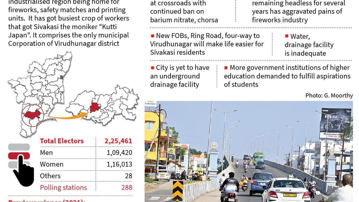 Constituency Watch – Sivakasi | Photo Credit: Rajesh R Sivakasi, the most industrialised region of Virudhunagar district, got the moniker of Kutti Japan. Besides being the hub for fireworks industry, it has hundreds of printing and match units that keeps the skilled and unskilled labourers engaged, in the otherwise arid region. However, all is not well with the fireworks industry that is facing lot of uncertainties over the few years. Published – April 10, 2026 09:50 pm IST Share this: Click to share on WhatsApp (Opens in new window) WhatsApp Click to share on Facebook (Opens in new window) Facebook Click to share on Threads (Opens in new window) Threads Click to share on X (Opens in new window) X Click to share on Telegram (Opens in new window) Telegram Click to share on LinkedIn (Opens in new window) LinkedIn Click to share on Pinterest (Opens in new window) Pinterest Click to email a link to a friend (Opens in new window) Email More Click to print (Opens in new window) Print Click to share on Reddit (Opens in new window) Reddit Click to share on Tumblr (Opens in new window) Tumblr Click to share on Pocket (Opens in new window) Pocket Click to share on Mastodon (Opens in new window) Mastodon Click to share on Nextdoor (Opens in new window) Nextdoor Click to share on Bluesky (Opens in new window) Bluesky Like this:Like Loading... Post navigation Conviction for man in POCSO case in just 29 days Israeli strike in south Lebanon kills 10 security personnel