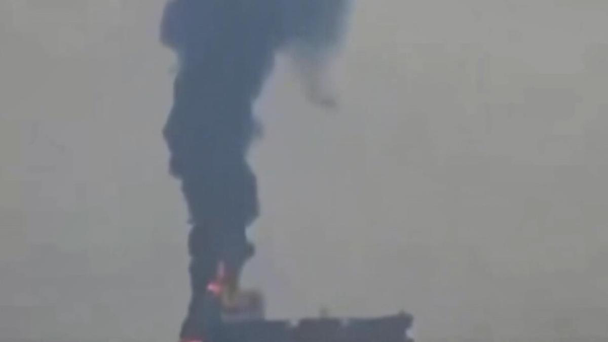 Smoke billows out from a Palau-flagged oil tanker with 15 Indian crew members after it came under attack from the Iranian military off Oman's Musandam peninsula.