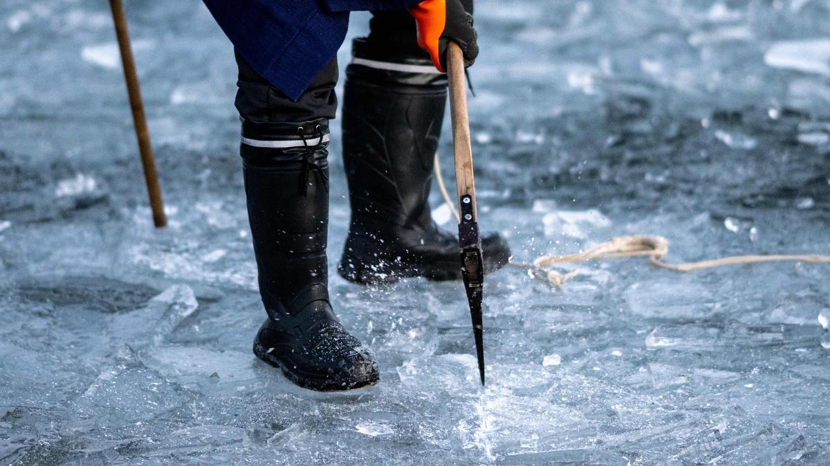 A parishioner of Yatsurugi Shrine cracks the ice with an axe on Lake Suwa in Nagano prefecture, January 29, 2026.