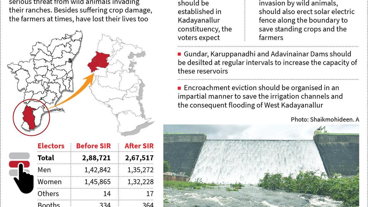 The Muslim-majority Kadayanallur constituency, which is deprived of any major development even though it was represented by a minister and influential MLAs in the past, is once again hopelessly listening to the long list of promises being made by the candidates in fray for the April 23 Assembly polls. Even the independent candidates had won Kadayanallur segment twice – in 1967 and 1980 – but the Congress has bagged this constituency only once – S. Peter Alphonse in 2006 – in the 13 Assembly elections held in this constituency since 1967. Former Minister P. Chendur Pandian in 2011 and his son C. Krishnamurali in 2021 have represented this constituency, housing sizeable Muslim voters. As Mr. Krishnamurali of AIADMK is seeking re-election, the DMK has given this seat to its ally, MDMK, which has fielded T.M. Rajendran in DMK’s ‘Rising Sun’ symbol. The Naam Thamizhar Katchi has nominated M. Abubaker Siddique and actor Vijay-led TVK has fielded R.K. Abdul Jalil. Of the 5 dams in Tenkasi district, Kadayanallur constituency houses 3 reservoirs – the smallest, but scenic Gundar Dam, Karuppanadhi and Adavinainar Dams – to keep farming alive. Apart from paddy cultivation, horticultural crops are widely grown along the Western Ghats boundary, which attract the wild animals including elephant, wild boar, Indian Gaur and deer that cause extensive damage to the standing crops. Farmers who try to chase the invading wild animals back into the reserve forest also get attacked and lose their lives at times. “Farmers suffer huge loss every year owing to wild animal invasion. Hence, the government, besides digging trenches along the Western Ghats border, should also erect solar electric fence to save the farmers from wild animal attack and the standing crops. Moreover, the farmers should be given due compensation for the crop damage caused by the wild animals,” says farmer S.T. Shaik Maideen of Kadayanallur. Another major demand of the farmers is the desilting of these 3 dams at regular intervals. “The Gundar, Karuppanadhi and Adavinainar Dams are not desilted for decades… Consequently, the storage capacity of these dams have dwindled drastically. Hence, the government should desilt the dams so as to facilitate farming in Kadayanallur constituency,” says farmer S. Mariappan of Kadayanallur. Even though the public are clamouring for removal of encroachments made along the Paappaan Channel that causes flooding of western parts of Kadayanallur, the official machinery adamantly refuses to carry-out impartial encroachment eviction drive. Since Tenkasi district has neither government engineering college nor medical college, the Kadayanallur voters expect the government to establish these institutions in their segment. “The Tamil Nadu Government, which miserably failed to get medical college for Tenkasi district, may get it sanctioned in future and hence a full-fledged medical college hospital has to be established in district. There is no sufficient space for upgrading the existing Tenkasi Government Hospital into a medical college hospital. Since the government has sufficient unused lands in Kadayanallur, a government medical college and hospital should be established here. While all other southern districts have government engineering college, the government has let down Tenkasi district. Hence, a government engineering college should also be established in Kadayanallur segment having 2 municipalities – Shencottai and Kadayanallur, 6 town panchayats and 4 panchayat unions,” says a doctor with Department of Public Health and serving in Tenkasi district. While the weaving industry of this segment is almost dead now due to poor patronage, the coconut pith coir-making units are also in deathbed due to lack of financial assistance for modernisation. Published – April 06, 2026 10:06 pm IST Share this: Click to share on WhatsApp (Opens in new window) WhatsApp Click to share on Facebook (Opens in new window) Facebook Click to share on Threads (Opens in new window) Threads Click to share on X (Opens in new window) X Click to share on Telegram (Opens in new window) Telegram Click to share on LinkedIn (Opens in new window) LinkedIn Click to share on Pinterest (Opens in new window) Pinterest Click to email a link to a friend (Opens in new window) Email More Click to print (Opens in new window) Print Click to share on Reddit (Opens in new window) Reddit Click to share on Tumblr (Opens in new window) Tumblr Click to share on Pocket (Opens in new window) Pocket Click to share on Mastodon (Opens in new window) Mastodon Click to share on Nextdoor (Opens in new window) Nextdoor Click to share on Bluesky (Opens in new window) Bluesky Like this:Like Loading... Post navigation GBA directs all corporations to procure one pothole-filling machine Worker dies during temple car festival at Narthamalai