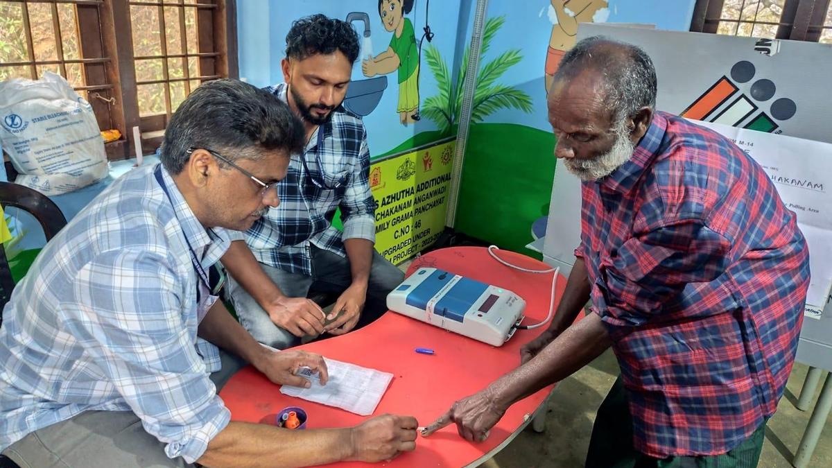 62-year-old Silvester, the first voter at the Pachakkanam booth in Idukki, cast his vote on Thursday. | Photo Credit: SPECIAL ARRANGEMENT Three people cast their votes at the remote Pachakkanam polling booth located deep within the Periyar Tiger Reserve. The booth was specifically set up at the Pachakkanam Anganwadi to accommodate a total of six registered voters: five men and one woman. The first voter, 62-year-old Silvester, cast his ballot around 7 a.m. He was later joined by two other voters, Aravindakshan and Prabu. Interestingly, Silvester was the only person to vote at this booth during the last local body election. Published – April 09, 2026 08:22 pm IST Share this: Click to share on WhatsApp (Opens in new window) WhatsApp Click to share on Facebook (Opens in new window) Facebook Click to share on Threads (Opens in new window) Threads Click to share on X (Opens in new window) X Click to share on Telegram (Opens in new window) Telegram Click to share on LinkedIn (Opens in new window) LinkedIn Click to share on Pinterest (Opens in new window) Pinterest Click to email a link to a friend (Opens in new window) Email More Click to print (Opens in new window) Print Click to share on Reddit (Opens in new window) Reddit Click to share on Tumblr (Opens in new window) Tumblr Click to share on Pocket (Opens in new window) Pocket Click to share on Mastodon (Opens in new window) Mastodon Click to share on Nextdoor (Opens in new window) Nextdoor Click to share on Bluesky (Opens in new window) Bluesky Like this:Like Loading... Post navigation Indian team to visit U.S. this month to discuss trade deal currently stuck in limbo Former Rajya Sabha member calls for unity among Arya Vysyas