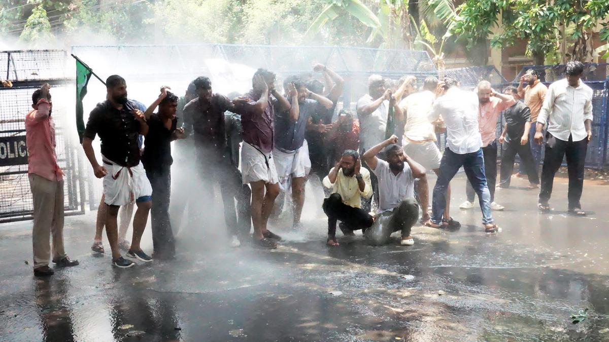 The police using water cannon to disperse members of Muslim Youth League during their protest march to the Commissioner’s Office in Kannur on Thursday following the death of dental student Nithin Raj.