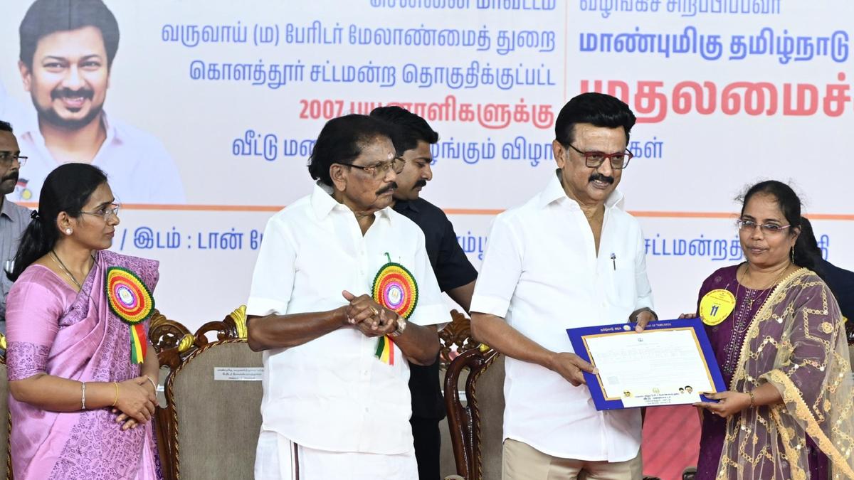 Chief Minister M.K. Stalin distributed house pattas to residents in his Kolathur Assembly constituency, in Chennai on Monday | Photo Credit: R. Ragu Tamil Nadu Chief Minister M.K. Stalin on Monday (February 23, 2026) said that his Kolathur Assembly constituency in Chennai has become a role model for the entire country. Listing the various welfare and development measures he has undertaken in the constituency over the past five years, Mr. Stalin claimed that many people from North India visited the hospital located in Periyar Nagar and were impressed by its state-of-the-art facilities. During his visit, Mr. Stalin inaugurated new buildings for the Arulmigu Kabaleeswarar College of Arts and Science under the Hindu Religious and Charitable Endowments (HR&CE) Department, constructed at a cost of ₹31.45 crore. He said he was proud of having established such a college and commended HR&CE Minister P.K. Sekarbabu. From the entrance to the classrooms, world-class facilities have been created on the college campus, he added. Mr. Stalin also inaugurated the Mudhalvar Padaippagam established on the college campus. He underlined the importance of education and urged students to focus on their studies. He further inaugurated various infrastructure projects undertaken by the Chennai Metropolitan Development Authority (CMDA) and the Greater Chennai Corporation (GCC), including a ration shop and an ICDS centre. He also distributed free housing pattas to around 2,000 beneficiaries. Ministers K.K.S.S.R. Ramachandran, S. Muthusamy, R. Sakkarapani, P.K. Sekarbabu, Govi. Chezhiaan, and Anbil Mahesh Poyyamozhi; Chennai Mayor R. Priya; MPs Kalanidhi Veeraswamy and R. Girirajan; legislators Thayagam Kavi, A. Vetriazhagan, and Joseph Samuel; and senior officials were also present. Published – February 23, 2026 04:35 pm IST Share this: Click to share on WhatsApp (Opens in new window) WhatsApp Click to share on Facebook (Opens in new window) Facebook Click to share on Threads (Opens in new window) Threads Click to share on X (Opens in new window) X Click to share on Telegram (Opens in new window) Telegram Click to share on LinkedIn (Opens in new window) LinkedIn Click to share on Pinterest (Opens in new window) Pinterest Click to email a link to a friend (Opens in new window) Email More Click to print (Opens in new window) Print Click to share on Reddit (Opens in new window) Reddit Click to share on Tumblr (Opens in new window) Tumblr Click to share on Pocket (Opens in new window) Pocket Click to share on Mastodon (Opens in new window) Mastodon Click to share on Nextdoor (Opens in new window) Nextdoor Click to share on Bluesky (Opens in new window) Bluesky Like this:Like Loading... Post navigation Farmer trampled to death by wild elephant in Kadambur hills Two persons arrested for flying kites using banned manja in Tiruvottiyur