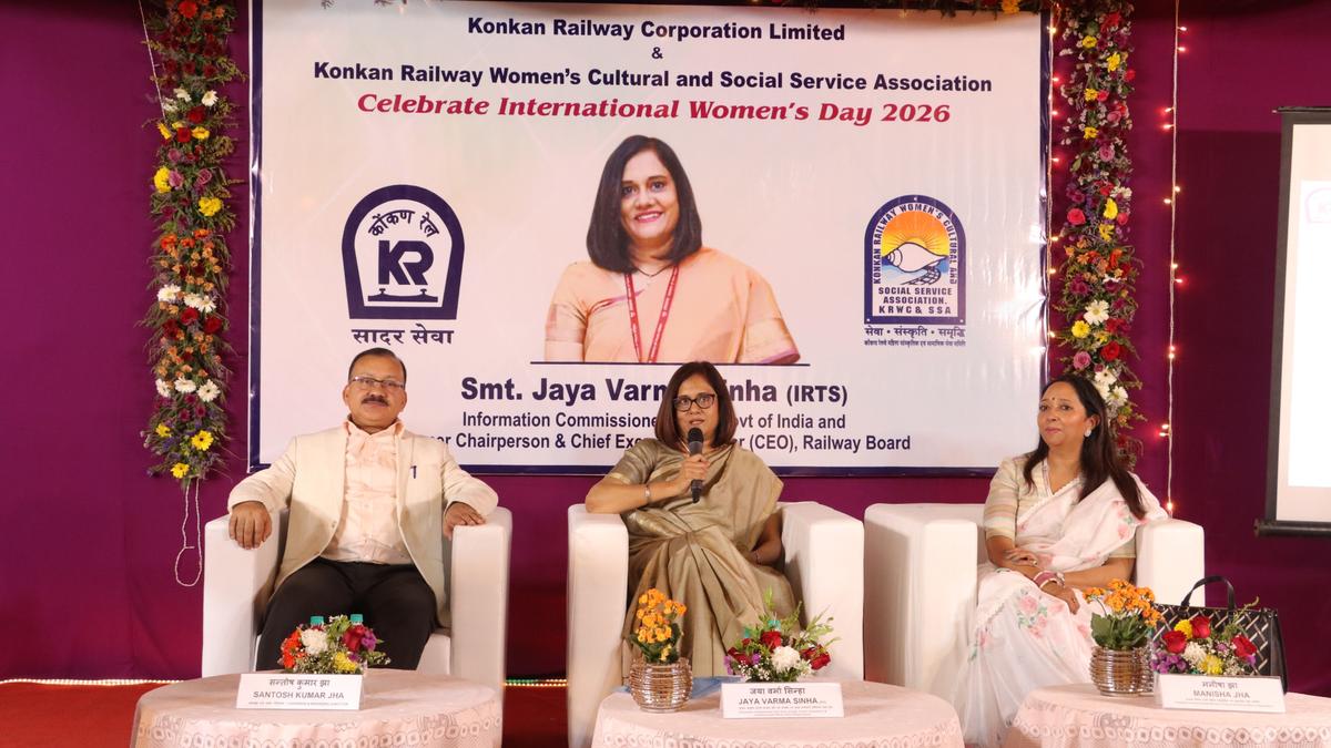 Central Information Commission’s Information Commissioner Jaya Varma Sinha speaking at the Women’s Day celebrations organised by Konkan Railway Corporation Ltd., on Monday at Navi Mumbai. | Photo Credit: SPECIAL ARRANGEMENT Konkan Railway Corporation Limited (KRCL), in association with the Konkan Railway Women’s Cultural and Social Service Association celebrated International Women’s Day at Navi Mumbai on Monday. Social Service Association President Manisha Jha in her introductory address highlighted the role and status of women in ancient India and emphasised the importance of ensuring equal opportunities and recognition for women in society. Published – March 11, 2026 09:17 pm IST Share this: Click to share on WhatsApp (Opens in new window) WhatsApp Click to share on Facebook (Opens in new window) Facebook Click to share on Threads (Opens in new window) Threads Click to share on X (Opens in new window) X Click to share on Telegram (Opens in new window) Telegram Click to share on LinkedIn (Opens in new window) LinkedIn Click to share on Pinterest (Opens in new window) Pinterest Click to email a link to a friend (Opens in new window) Email More Click to print (Opens in new window) Print Click to share on Reddit (Opens in new window) Reddit Click to share on Tumblr (Opens in new window) Tumblr Click to share on Pocket (Opens in new window) Pocket Click to share on Mastodon (Opens in new window) Mastodon Click to share on Nextdoor (Opens in new window) Nextdoor Click to share on Bluesky (Opens in new window) Bluesky Like this:Like Loading... Post navigation Civilians held captive, fresh tension in Manipur’s Ukhrul Interest of the state to preserve life cannot overpower right to dignified death: Supreme Court