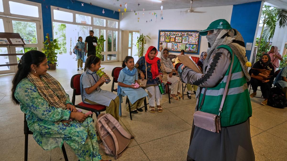 A health worker, right, briefs women and their daughters about human papillomavirus (HPV) vaccination during a campaign aiming to protect girls from cervical cancer, at a vaccination centre, Karachi, Pakistan.