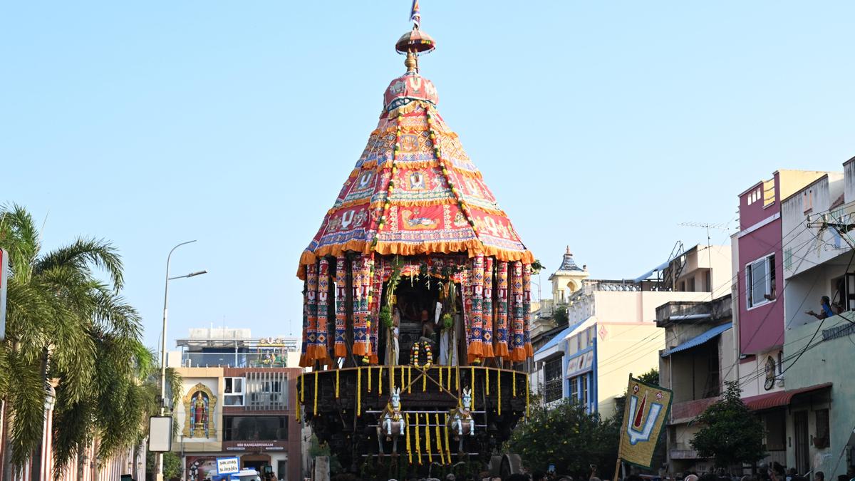Devotees pulling the “Thai Ther” of Sri Ranganathaswamy at Srirangam on Saturday. | Photo Credit: M. MOORTHY A large number of devotees thronged Srirangam and pulled the temple car of the Sri Ranganathaswamy Temple here on Saturday as part of the “Bhoopathi Thirunal” festival held in the Tamil month of Thai. Sri Namperumal, processional deity of the temple, along with Ubhaya Nachiyars were taken out in a procession in the early hours to the Thai Ther Mandapam where rituals were performed. After completion of all rituals, the decorated Thai Ther with the deities began its procession around 6 a.m. Devotees, who came from different parts of Tiruchi and other places of the State, pulled the temple car amid chants of ‘Ranga Ranga’. Many devotees, who came from Srirangam to visit Sri Ranganathaswamy from different parts of the country, took part in the festival. It went around the four ‘Uthira Veedhis’ and returned to the base (Nilai) at around 9.15 a.m. The 11-day festival began on January 23 with the flag hoisting. It concludes on Sunday. Published – January 31, 2026 06:01 pm IST Share this: Click to share on WhatsApp (Opens in new window) WhatsApp Click to share on Facebook (Opens in new window) Facebook Click to share on Threads (Opens in new window) Threads Click to share on X (Opens in new window) X Click to share on Telegram (Opens in new window) Telegram Click to share on LinkedIn (Opens in new window) LinkedIn Click to share on Pinterest (Opens in new window) Pinterest Click to email a link to a friend (Opens in new window) Email More Click to print (Opens in new window) Print Click to share on Reddit (Opens in new window) Reddit Click to share on Tumblr (Opens in new window) Tumblr Click to share on Pocket (Opens in new window) Pocket Click to share on Mastodon (Opens in new window) Mastodon Click to share on Nextdoor (Opens in new window) Nextdoor Click to share on Bluesky (Opens in new window) Bluesky Like this:Like Loading... Post navigation Distance learning accounts for more than a tenth of India’s higher education GER: Union Minister Kerala SIR: 11.66 lakh applications for enrolment filed