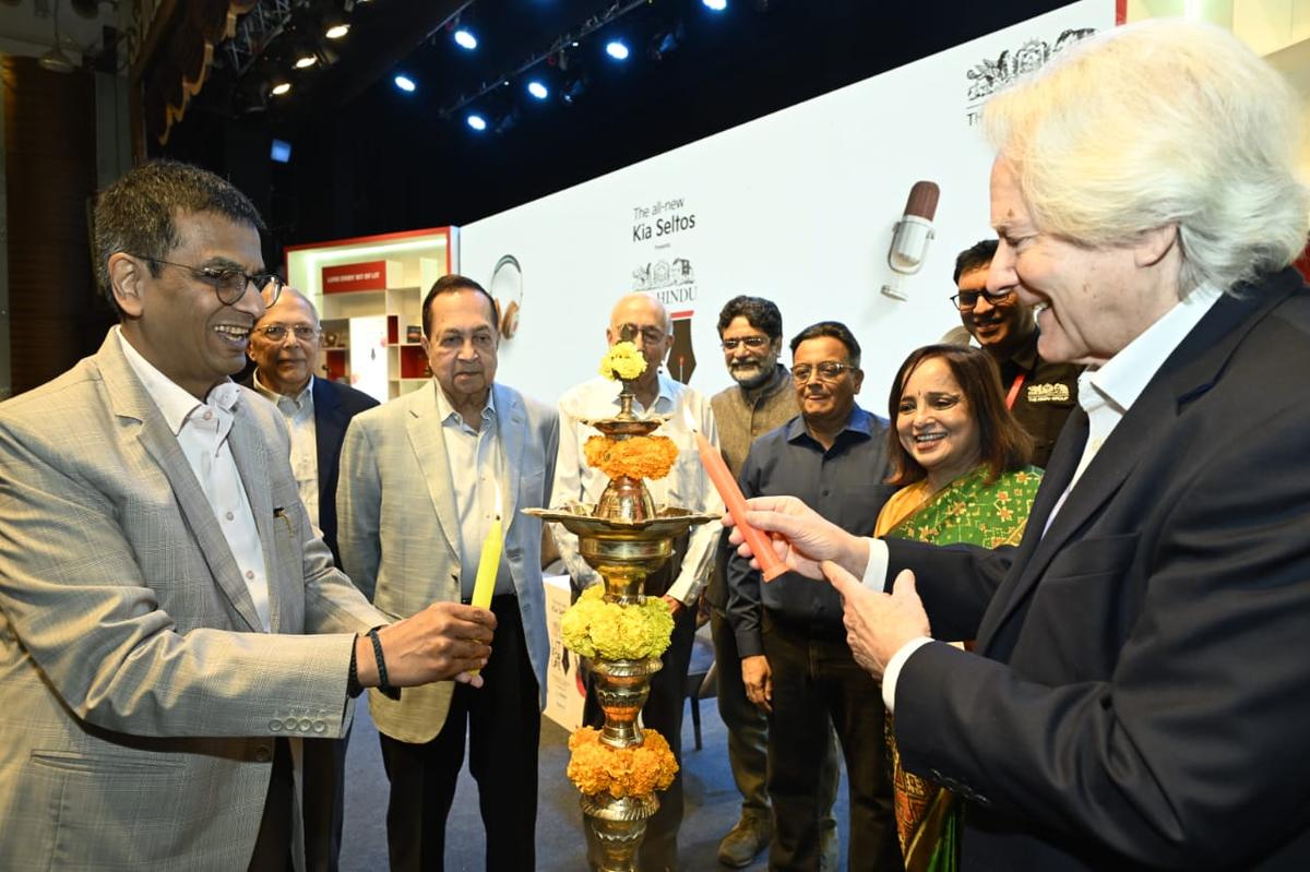 A.C. Grayling, eminent philosopher and author, D.Y. Chandrachud, former Chief Justice of India, Nirmala Lakshman, Chairperson of The Hindu Group Publishing Pvt Ltd, N. Ravi, Director , Kasturi & Sons,, Ltd., Suresh Nambath, Editor, The Hindu, L. Navneerh, CEO, The Hindu Group, and Suresh Balakrishna, CRO, The Hindu Group at the inauguration of the The Hindu Lit for Life 2026.