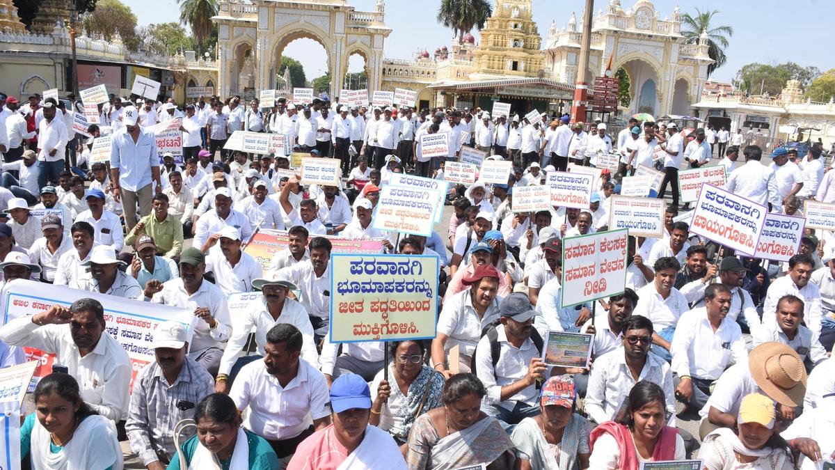 The licenced surveyors from different districts gathered in front of the Kote Anjaneya Swamy Temple near Mysuru palace demanding that the government fulfil its promise to regularise their services, provide them job security, and “equal pay for equal work”.