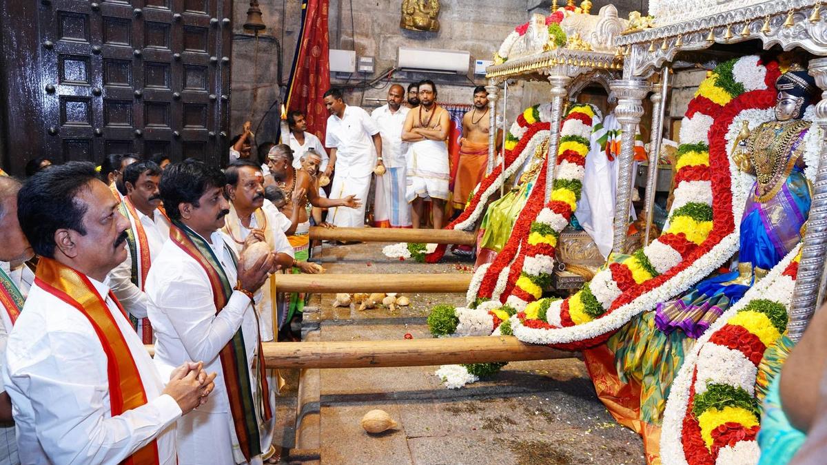 Prayers being offered to ‘Pancha Moorthis’ on silver Ambari at Srikalahastheeswara Swamy temple in Srikalahasti on Wednesday. | Photo Credit: BY ARRANGEMENT The Maha Sivaratri Brahmotsavams at Srikalahastheeswara Swamy Devasthanam commenced on Wednesday with the traditional hoisting of the sacred ‘Dhwajapatam’ atop the temple flag post. Known as ‘Kodi Utsavam’, the temple priests participated in the ritual and hoisted the flag amid chanting of the hymns. According to mythology, the day is called ‘Devaratri’ and assigned great significance. The flag was hoisted atop the gold-gilded flag post situated opposite the main sanctum sanctorum. A ‘homam’ was performed ahead of the event and holy water sprinkled on the flag post. Saris presented by devotees were adorned to the flag post ahead of hoisting. The flag hoisting is meant to signal the launch of the annual festival. As local MLA Bojjala Sudheer Reddy was away on official duty in Vijayawada, his mother, B. Brundamma, and his spouse, B. Rishitha Reddy, participated in the vent on his behalf. They were accompanied by temple trust board Chairman Kotte Saiprasad, Executive Officer T. Bapi Reddy and BJP State vice-president Kola Anand, among others. Meanwhile, the ‘Pancha Moorthis’ were carried in a grand procession through the town on a silver Ambari, an event known as ‘Gramotsavam’. State Bank of India (SBI), on the other hand, presented 200 dhotis and t-shirts to the ‘Vahanam’ bearers and ‘Sripada Sevaks’ working in the temple. Similarly, drug dealers came forward to offer medicines to the temple. Published – February 11, 2026 08:34 pm IST Share this: Click to share on WhatsApp (Opens in new window) WhatsApp Click to share on Facebook (Opens in new window) Facebook Click to share on Threads (Opens in new window) Threads Click to share on X (Opens in new window) X Click to share on Telegram (Opens in new window) Telegram Click to share on LinkedIn (Opens in new window) LinkedIn Click to share on Pinterest (Opens in new window) Pinterest Click to email a link to a friend (Opens in new window) Email More Click to print (Opens in new window) Print Click to share on Reddit (Opens in new window) Reddit Click to share on Tumblr (Opens in new window) Tumblr Click to share on Pocket (Opens in new window) Pocket Click to share on Mastodon (Opens in new window) Mastodon Click to share on Nextdoor (Opens in new window) Nextdoor Click to share on Bluesky (Opens in new window) Bluesky Like this:Like Loading... Post navigation Green signal for Beypore port’s development in PPP mode Justice Sasidharan Commission ready to submit report on OBC reservation for local body polls in U.T.