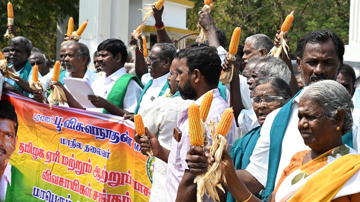 Members of the Tamizhaga Eri Mattrum Attru Pasana Vivasayigal Sangam staged a protest near the Collector’s Office in Tiruchi on Monday to draw the attention of the authorities to the steep fall in the procurement price of maize in the open market.