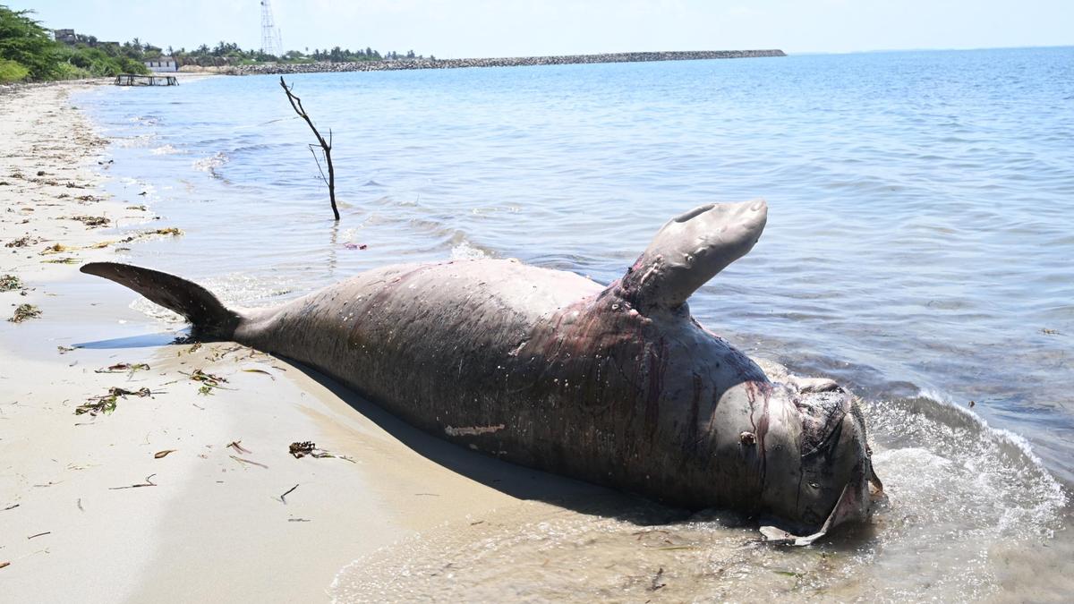 The carcass of a Dugong that was washed ashore in Mandapam in Ramanathapuram district on Wednesday.