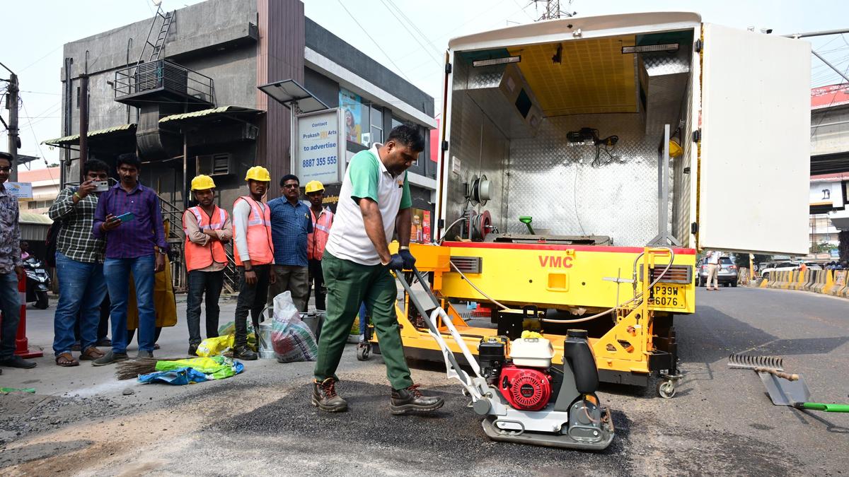 Vijayawada Municipal Corporation (VMC) Mayor and civic officials inspect the advanced Infrared Road Pothole Repairing Mobile Machine, popularly known as the “Road Doctor”, during its inauguration at Gurunanak Colony main road in Vijayawada. The number of wards has increased from 64 to 86 in Vijayawada. (File)