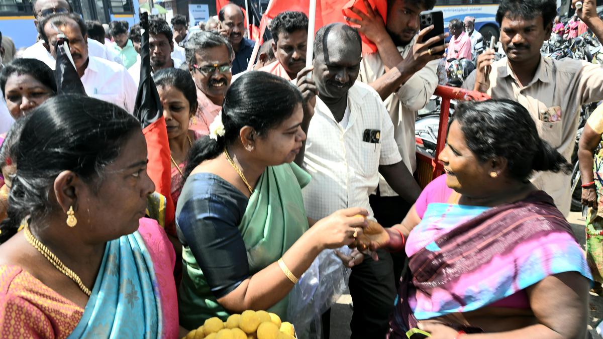 Tamil Nadu Minister for Social Welfare and Women Empowerment and DMK’s Thoothukudi north district secretary Geetha Jeevan distributes sweets to women at the old bus stand in Thoothukud on Friday.
