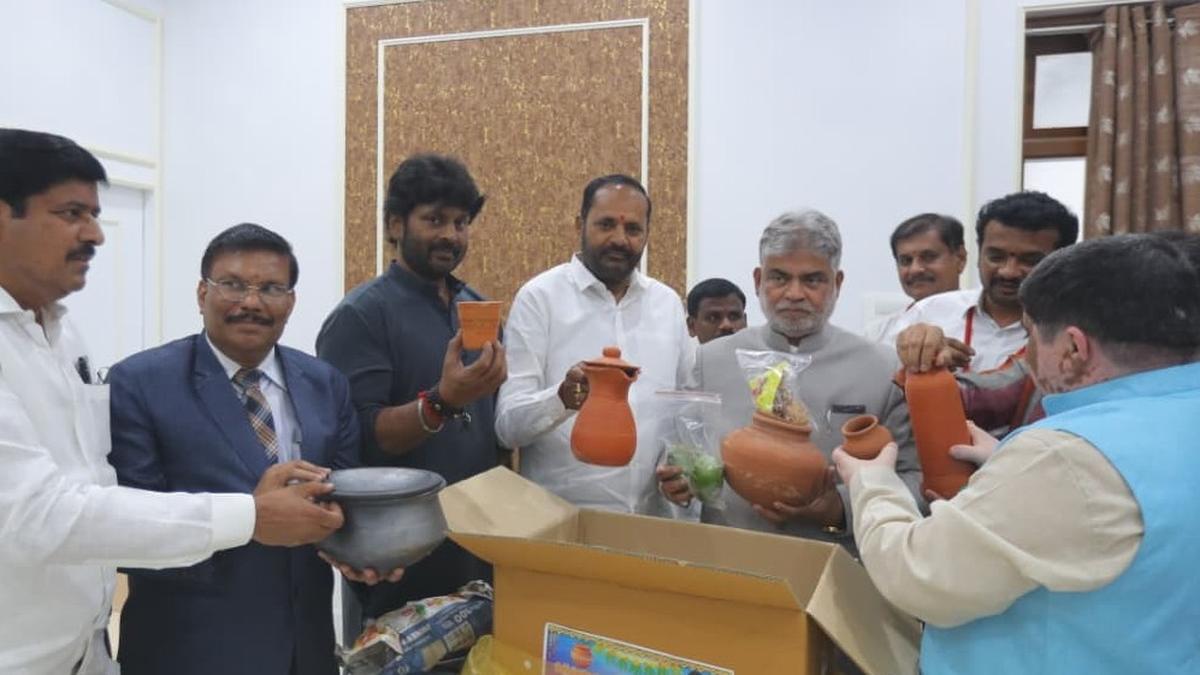 Minister Ponnam Prabhakar, Assembly Speaker Gaddam Prasad Kumar and others showing the Ugadi kits on the premises of Assembly on Wednesday. Minister of Transport and BC Welfare Ponnam Prabhakar has presented Ugadi kits containing traditional clay pots to Legislative Council Chairman Gutta Sukhender Reddy, Assembly Speaker Gaddam Prasad Kumar, and Deputy Chief Minister Mallu Bhatti Vikramarka on the premises of the Telangana Legislative Assembly on Wednesday on the occasion of the ‘Parabhava Nama’ Telugu New Year. Marking the Ugadi celebrations, the Minister launched the theme “Use clay pots, protect health – promote caste professions.” As part of this initiative, he handed over specially prepared Ugadi kits containing clay pots, glasses, jugs, bowls, along with festival essentials such as mango leaves, neem flowers, jaggery, tamarind, and chillies. Extending festive greetings to people of the State, Mr. Prabhakar underscored the cultural and ecological importance of using clay utensils. He emphasised that clayware, deeply rooted in local tradition, is not only environmentally friendly but also beneficial for health. Encouraging citizens to adopt sustainable practices, he noted that promoting clay products supports traditional occupational communities and preserves age old craftsmanship. The Minister urged people to celebrate Ugadi with the message “Use clay pots, protect caste professions, safeguard health,” and highlighted that increasing use of clay items would help revive traditional livelihoods while fostering environmental conservation. Published – March 18, 2026 07:12 pm IST Share this: Click to share on WhatsApp (Opens in new window) WhatsApp Click to share on Facebook (Opens in new window) Facebook Click to share on Threads (Opens in new window) Threads Click to share on X (Opens in new window) X Click to share on Telegram (Opens in new window) Telegram Click to share on LinkedIn (Opens in new window) LinkedIn Click to share on Pinterest (Opens in new window) Pinterest Click to email a link to a friend (Opens in new window) Email More Click to print (Opens in new window) Print Click to share on Reddit (Opens in new window) Reddit Click to share on Tumblr (Opens in new window) Tumblr Click to share on Pocket (Opens in new window) Pocket Click to share on Mastodon (Opens in new window) Mastodon Click to share on Nextdoor (Opens in new window) Nextdoor Click to share on Bluesky (Opens in new window) Bluesky Like this:Like Loading... Post navigation BMTC to roll out smart ticketing system with 11,000 digital ETM devices Police, doctors lay emphasis on helmet use for road safety