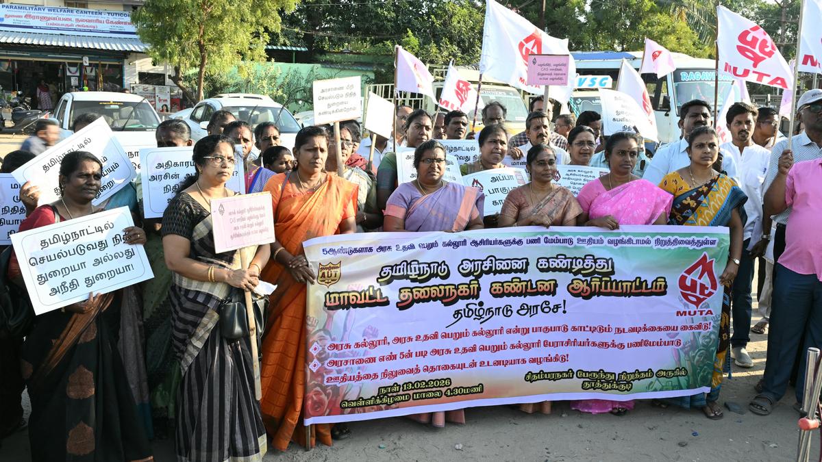 Members of the Madurai Kamaraj, Manonmaniam Sundaranar, Mother Teresa, and Alagappa University Teachers’ Association (MUTA) staging a demonstration in Thoothukudi on Friday. | Photo Credit: N. RAJESH Members of MUTA (Madurai Kamaraj University, Manonmaniam Sundaranar University, Mother Teresa Women’s University and Alagappa University) along with Association of University Teachers (AUT) staged a demonstration in Thoothukudi on Friday, demanding the release of Career Advancement Scheme (CAS) benefits. The protesting members said that while CAS benefits have been granted to teachers working government colleges, it has been withheld for the past five years for teachers working in government-aided colleges. They added that although Higher Education Minister had assured that the CAS benefits would be included in January month’s salary, no action was taken. They further said that teachers had conducted a 16 day sit-in protest in their respective colleges to release the benefits. Subsequently, it was stated that the amount would be included in the February salary, but no steps have been taken so far. Over 100 assistant professors from seven colleges participated in the protest and raised slogans, urging the government to release the CAS benefits to aided college teachers. Published – February 13, 2026 08:57 pm IST Share this: Click to share on WhatsApp (Opens in new window) WhatsApp Click to share on Facebook (Opens in new window) Facebook Click to share on Threads (Opens in new window) Threads Click to share on X (Opens in new window) X Click to share on Telegram (Opens in new window) Telegram Click to share on LinkedIn (Opens in new window) LinkedIn Click to share on Pinterest (Opens in new window) Pinterest Click to email a link to a friend (Opens in new window) Email More Click to print (Opens in new window) Print Click to share on Reddit (Opens in new window) Reddit Click to share on Tumblr (Opens in new window) Tumblr Click to share on Pocket (Opens in new window) Pocket Click to share on Mastodon (Opens in new window) Mastodon Click to share on Nextdoor (Opens in new window) Nextdoor Click to share on Bluesky (Opens in new window) Bluesky Like this:Like Loading... Post navigation AAIB preliminary report on plane crash near Baramati to be released very soon: Civil Aviation Minister Traffic diversions announced in Darussalam area for AIMIM event today