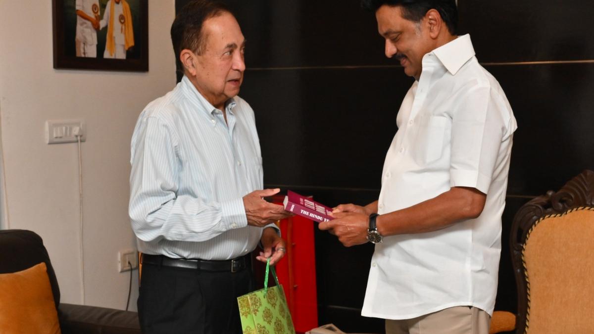 Director of The Hindu Publishing Group and former Editor-in-Chief of The Hindu Group of Publications N. Ram presenting the Tamil Nadu Chief Minister M.K. Stalin with The Hindu Year Book 2026.
