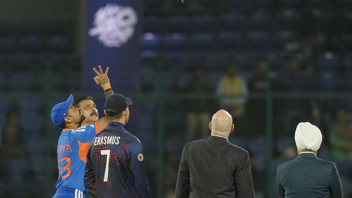 India’s captain Suryakumar Yadav, front left, and Namibia’s captain Gerhard Erasmus, front second left, with former cricketer and commentator Ravi Shastri, back left, and others during the toss before an ICC Men’s T20 World Cup 2026 cricket match between India and Namibia, at the Arun Jaitley Stadium, in New Delhi, on February 12, 2026.