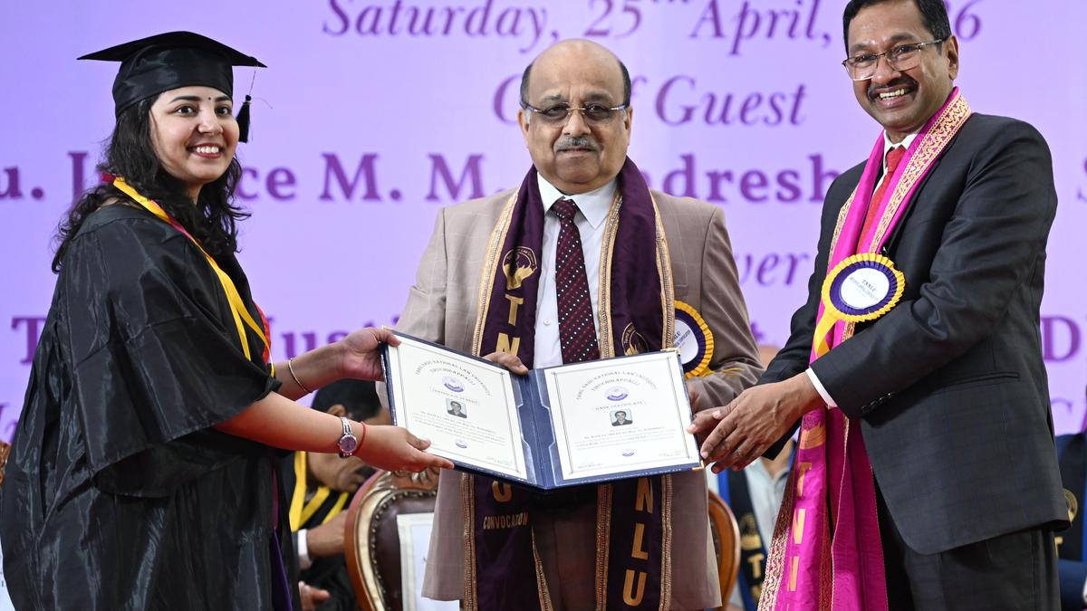 M.M. Sundresh, Judge, Supreme Court, presenting degree certificate and medals to a student at the convocation of the Tamil Nadu National Law University in Tiruchi on Saturday.