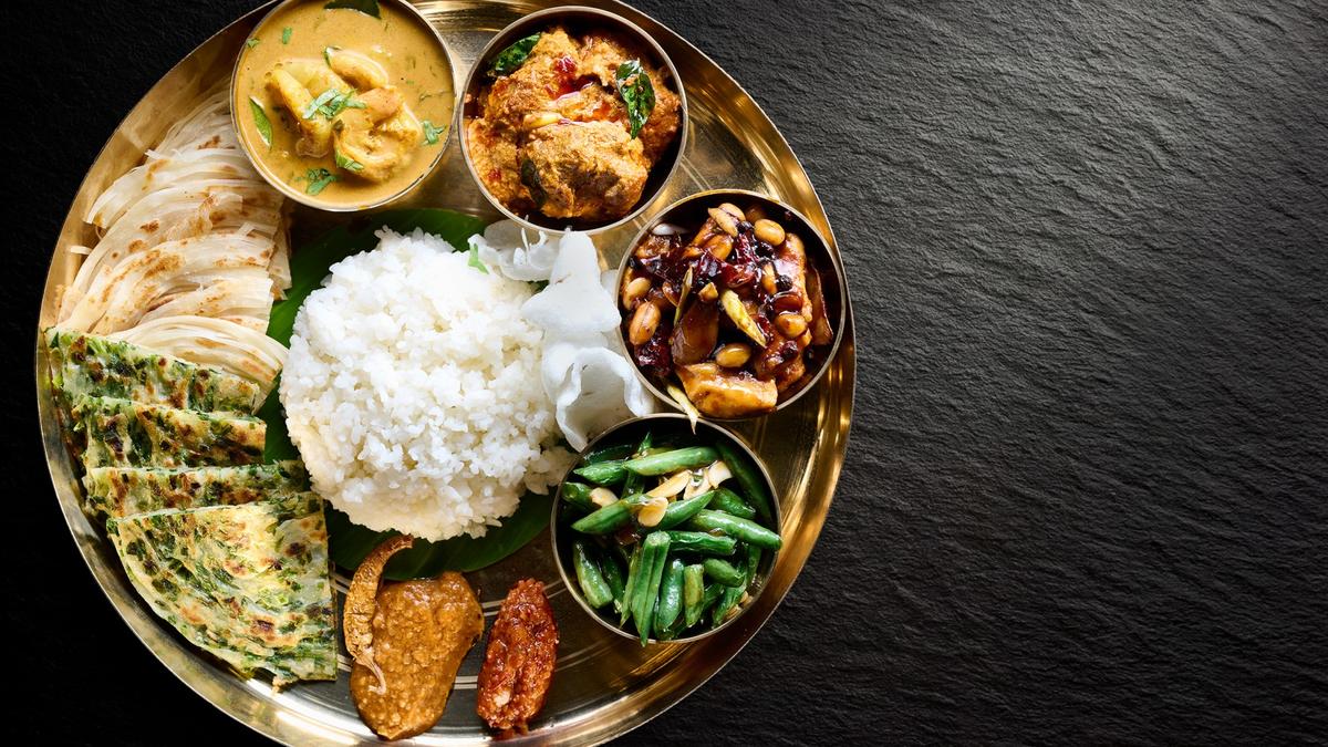 The non-vegetarian version of the meal includes a prawn Malay curry, a slow-cooked lamb rendang, and a wok-tossed kung pao chicken. All accompanied by steamed rice, stir-fry beans, and other accompaniments. The vegetarian selection features a vegetarian Malay curry, gajji bokkeum, kung pao potatoes, also served with rice, stir-fry beans, and crackers. Other accompaniments include Malay parata, scallion parata, chilli sambal, and a savoury peanut chutney.