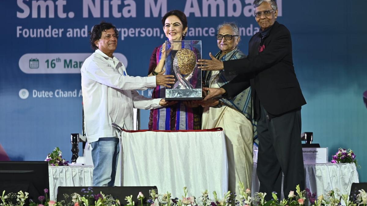 Bhubaneswar, March 16: Nita M. Ambani, Founder and Chairperson of Reliance Foundation, was conferred the prestigious KISS Humanitarian Award 2025 at Kalinga Institute of Social Sciences (KISS) campus here on Monday. The award was presented by Nobel Laureate from Sri Lanka Prof. Mohan Munasinghe in the presence of the Founder of KIIT, KISS and KIMS Dr Achyuta Samanta. Senior functionaries of the institutions and a large number of students and dignitaries attended the function. The award recognised Smt Ambani’s outstanding humanitarian initiatives and her significant contributions to social development through education, healthcare, rural transformation, women empowerment and sports promotion through the Reliance Foundation. In her acceptance speech, Smt. Ambani said that Dr. Samanta has built two modern temples of education — KIIT and KISS. These two institutions are a matter of pride for our country. She said that she feels proud to receive the prestigious KISS Humanitarian Award and added that the honour is not hers alone, but belongs to the entire team of Reliance Foundation. Addressing the 40,000 students of KISS, she said, “I will never forget the love and affection you have given me here.” She further said that it was truly a privilege for her to visit the two remarkable institutions, KIIT and KISS. She expressed that she was overwhelmed to come to the pious land of Lord Jagannath. She also added that Odisha has a rich culture, traditions and values, and that the people of Odisha share a deep and strong connection with nature She said that there is no difference between boys and girls and that whatever boys can do, girls can do as well. Advising the students, she said, “This is just the beginning, not your final goal. You should dream big, and to achieve those dreams, you must work hard with dedication.” She further advised the students never to leave the path of righteousness. “I see the future of India here in KISS. After seeing the children here, I am confident that the future of India is bright,” she added. The KISS Humanitarian Award, initiated in 2008 by Dr Samanta, is the highest honour of KISS, dedicated to recognising individuals and organisations that embody the spirit of humanitarian work worldwide. The award consists of a citation scroll and a gold-plated trophy. The trophy symbolises the golden heart of a humanitarian representing the virtues of purity, kindness, prosperity and hope. It features a pair of hands uplifting a heart textured with shapes resembling waving hands, signifying how dedicated efforts can transform the lives of the underprivileged and make the world a better place. In his welcome speech, Dr. Samanta said, Success doesn’t mean achieving things only for yourself; true success is bringing light into the lives of others.” Giving example of Nita Ambani he said, Great initiatives never go in vain if you try with dedication. He praised Nita for her multi-dimensional social work, for which she is loved and respected by one and all. In this materialistic world, earning love and respect is not easy. However, Mrs. Ambani has earned immense love and respect from people for her noble social and humanitarian work. He thanked Mrs. Ambani for graciously accepting the KISS Humanitarian Award. “This article is part of the sponsored content programme.” Published – March 17, 2026 05:26 pm IST Share this: Click to share on WhatsApp (Opens in new window) WhatsApp Click to share on Facebook (Opens in new window) Facebook Click to share on Threads (Opens in new window) Threads Click to share on X (Opens in new window) X Click to share on Telegram (Opens in new window) Telegram Click to share on LinkedIn (Opens in new window) LinkedIn Click to share on Pinterest (Opens in new window) Pinterest Click to email a link to a friend (Opens in new window) Email More Click to print (Opens in new window) Print Click to share on Reddit (Opens in new window) Reddit Click to share on Tumblr (Opens in new window) Tumblr Click to share on Pocket (Opens in new window) Pocket Click to share on Mastodon (Opens in new window) Mastodon Click to share on Nextdoor (Opens in new window) Nextdoor Click to share on Bluesky (Opens in new window) Bluesky Like this:Like Loading... Post navigation No LPG? No problem: Cook delicious meals without a gas stove Kerala HC stays remarks made by Vigilance Court, Kollam, while granting bail to Sabarimala tantri