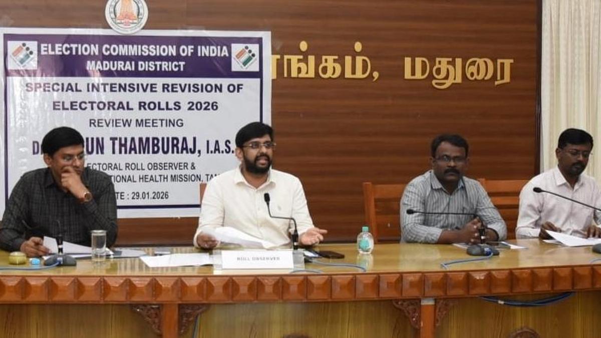 Officials inspect Special Intensive Revision works in a review meeting held in Madurai on Thursday. | Photo Credit: Special Arrangement Roll Observer and Director of the National Health Mission, Tamil Nadu, A. Arun Thamburaj, along with District Collector K.J. Praveen Kumar, conducted a review meeting here on Thursday with the officials regarding the Special Intensive Revision of Electoral Rolls – 2026. During the meeting, Mr. Arun Thamburaj, instructed the officials that the applications related to Form 6 must be resolved on a daily basis without any pendency. “The rejection of Form 6 (New Voter Inclusion) must be handled with extreme care and should only be done based on proper inquiry and evidence. All correction works must be properly audited through Deputy Tahsildar (Elections),” he added. Quality must be ensured in the disposal of applications and in cases where discrepancies are found, decisions should be taken only after issuing proper notices and obtaining valid explanations, he noted. He directed the election officials to work in coordination to ensure that the electoral roll is prepared comprehensively and without errors. Further, he along with the Madurai District Collector K.J. Praveen Kumar carried out field verification of forms received regarding the inclusion of names, corrections, and transfers in the electoral rolls in various areas, including Villapuram under Thirupparankundram Assembly Constituency, Munichalai and Kamarajar Salai under Madurai South Constituency, Valluvar Colony under Madurai North Constituency, and Muthamizh Nagar and Kosakulam Pandian Nagar under Madurai East Constituency. The officials also inspected the mobile demonstration vehicle creating awareness among the public regarding the functioning of Electronic Voting Machines (EVM) in the Narimedu area, which fell under the Madurai North Assembly Constituency. Published – January 29, 2026 09:47 pm IST Share this: Click to share on WhatsApp (Opens in new window) WhatsApp Click to share on Facebook (Opens in new window) Facebook Click to share on Threads (Opens in new window) Threads Click to share on X (Opens in new window) X Click to share on Telegram (Opens in new window) Telegram Click to share on LinkedIn (Opens in new window) LinkedIn Click to share on Pinterest (Opens in new window) Pinterest Click to email a link to a friend (Opens in new window) Email More Click to print (Opens in new window) Print Click to share on Reddit (Opens in new window) Reddit Click to share on Tumblr (Opens in new window) Tumblr Click to share on Pocket (Opens in new window) Pocket Click to share on Mastodon (Opens in new window) Mastodon Click to share on Nextdoor (Opens in new window) Nextdoor Click to share on Bluesky (Opens in new window) Bluesky Like this:Like Loading... Post navigation Indigenous manufacturing takes centre stage at Wings India 2026, Hyderabad firm puts regional aircraft on show Death toll in Kolkata warehouse fire rises to 21 with ‘27 reported missing’