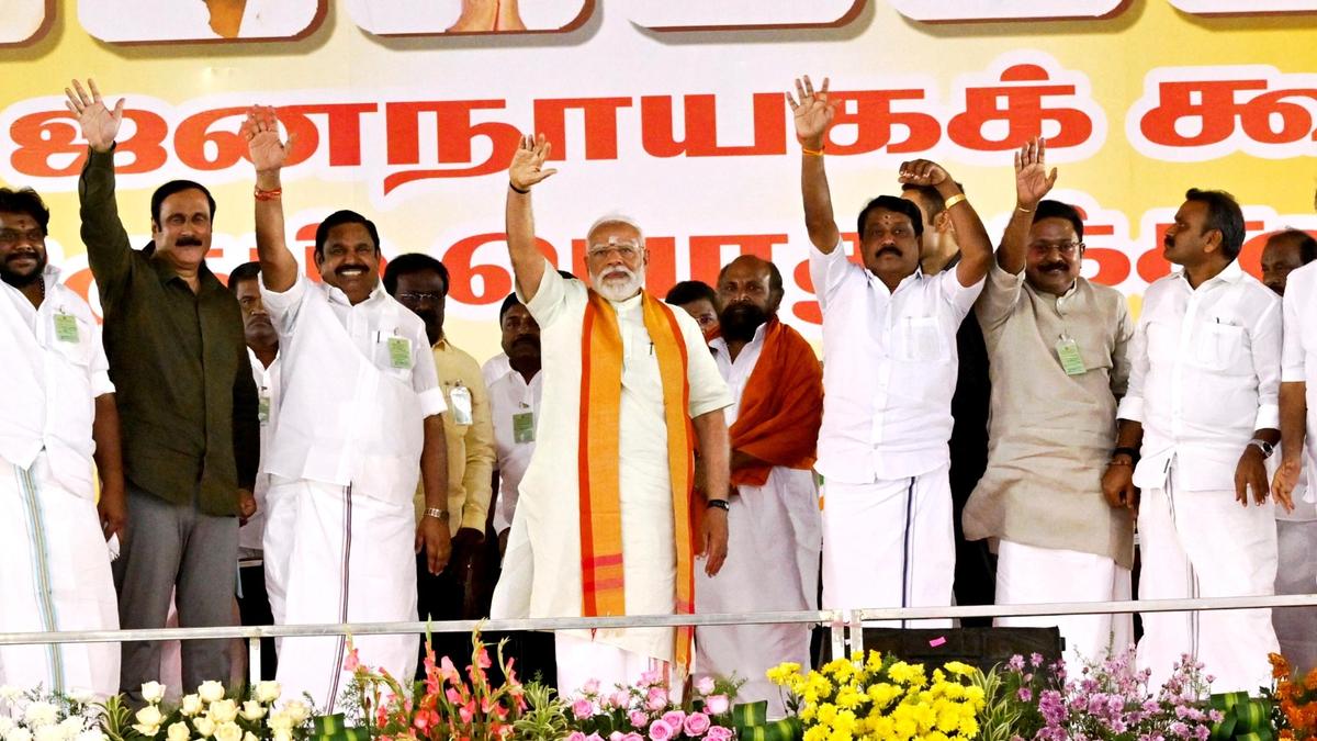 Prime Minister Narendra Modi and other leaders at a public meeting organised by the NDA in Madurai on Sunday, March 1, 2026