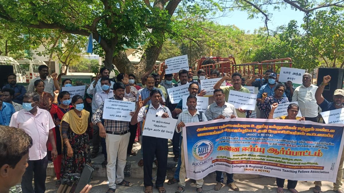 The protest was organised by Anna University Constituent Colleges and Regional Campuses Temporary Assistant Professors Association. “Over 320 temporary assistant professors who worked in 13 constituent colleges and three regional campuses were removed from their jobs by the Anna University administration in January this year,” said E. Venkatraman, organiser of the association.
