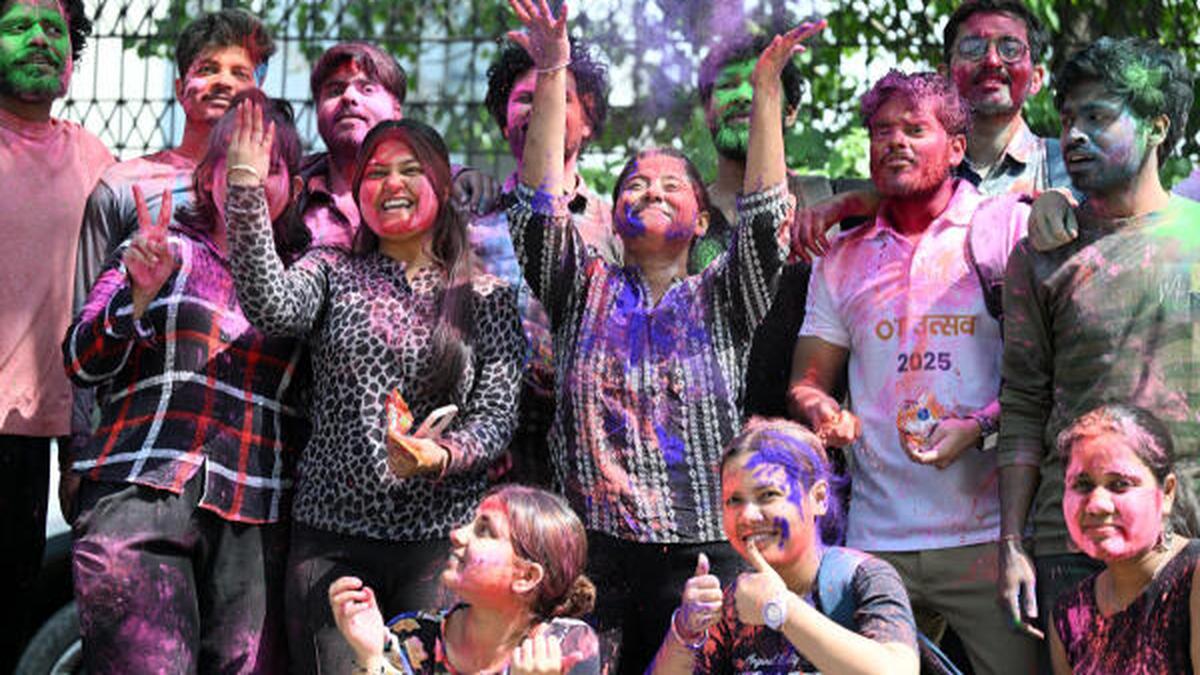 College students celebrating Holi in New Delhi on Tuesday.