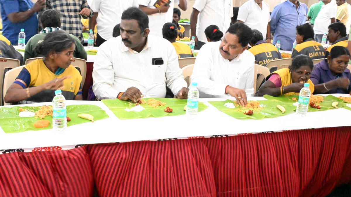 Collector C. Dinesh Kumar launched the free meal scheme in Krishnagiri on Monday. | Photo Credit: BASHKARAN N. Over 2,028 sanitation workers will be provided meals free-of-cost under the free meal scheme in the district covering one municipality, one Corporation and six town panchayats. The scheme was launched on the heels of Chief Minister M.K. Stalin launching the scheme for urban local bodies workers and town panchayat sanitation workers. The scheme would cover 1,354 sanitation workers in Hosur Corporation, 73 permanent sanitation workers in Krishnagiri Municipality, 131 temporary sanitation workers in Krishnagiri Municipality, 22 temporary drivers, 13 sanitation workers of municipality schools, and 91 dengue prevention workers. The scheme would also cover 66 sanitation workers in Bargur town panchayat, 87 in Denkanikottai town panchayat; 52 in Kaveripattinam town panchayat; 43 in Kelamangalam town panchayat; 33 in Nagojanahalli town panchayat and 63 in Uthangarai town panchayat. Collector C. Dinesh Kumar launched the scheme at TP Road marriage hall for the sanitation workers. Safety kits were also provided to them. Published – February 09, 2026 07:37 pm IST Share this: Click to share on WhatsApp (Opens in new window) WhatsApp Click to share on Facebook (Opens in new window) Facebook Click to share on Threads (Opens in new window) Threads Click to share on X (Opens in new window) X Click to share on Telegram (Opens in new window) Telegram Click to share on LinkedIn (Opens in new window) LinkedIn Click to share on Pinterest (Opens in new window) Pinterest Click to email a link to a friend (Opens in new window) Email More Click to print (Opens in new window) Print Click to share on Reddit (Opens in new window) Reddit Click to share on Tumblr (Opens in new window) Tumblr Click to share on Pocket (Opens in new window) Pocket Click to share on Mastodon (Opens in new window) Mastodon Click to share on Nextdoor (Opens in new window) Nextdoor Click to share on Bluesky (Opens in new window) Bluesky Like this:Like Loading... Post navigation CM urged to lobby for setting up national pharma institute in capital ‘Arthik Hindu Mahasangam’ to be held in Hubballi