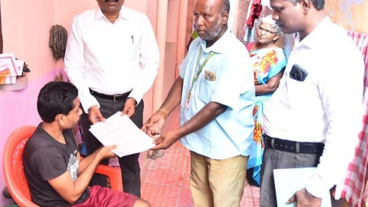 Collector G. Sukumar hands over a postal ballot paper to a differently abled person in Tirunelveli on Saturday.