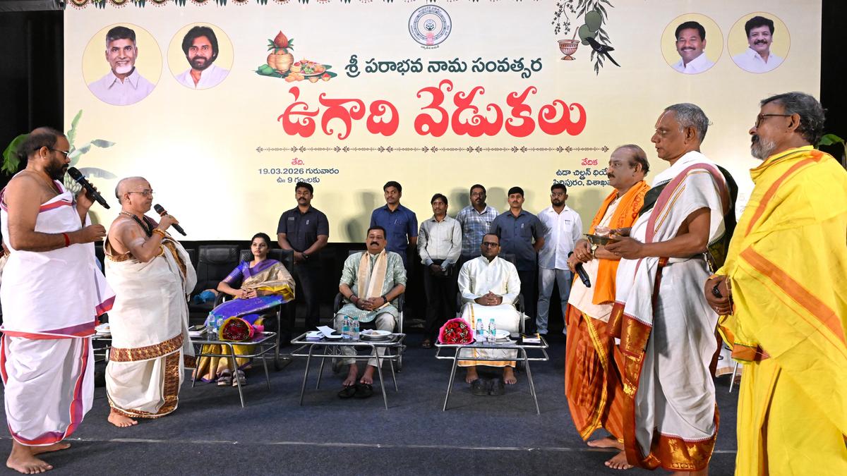 Pundits read the annual almanac during the ‘Paraabhava Nama Ugadi’ utsav celebrated by the State government at VMRDA Children’s Arena in Visakhapatnam on Thursday.