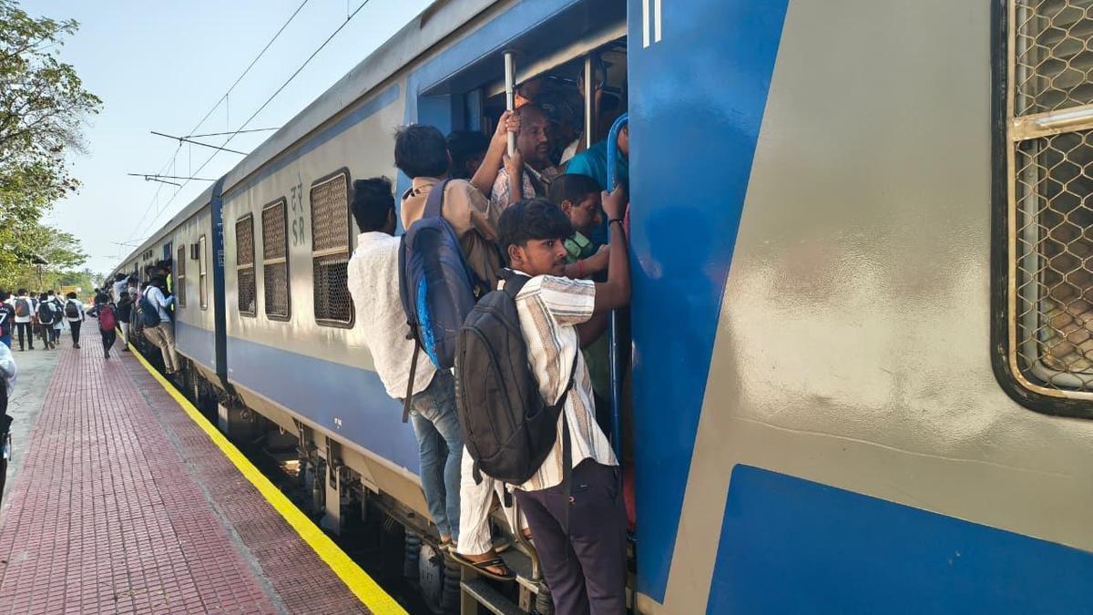 A solution to the struggle by passengers travelling in the overcrowded Mettupalayam-Coimbatore MEMU train seems elusive. | Photo Credit: Special Arrangement The patience of passengers travelling in claustrophobic conditions in eight coaches of the Mettupalayam-Coimbatore MEMU train appears to be wearing thin, over the purported delay by the Railways to operate the services with 12 compartments. The Railways had announced that certain train services in the sector will be operated with the additional coaches from February 23. Passenger crowd in the train keeps rising for travel during the peak hours. According to a tentative assessment, not less than 3,000 passengers travel by the eight compartments. Passengers travelling on the train footboard could be seen clinging precariously. Published – March 05, 2026 07:58 pm IST Share this: Click to share on WhatsApp (Opens in new window) WhatsApp Click to share on Facebook (Opens in new window) Facebook Click to share on Threads (Opens in new window) Threads Click to share on X (Opens in new window) X Click to share on Telegram (Opens in new window) Telegram Click to share on LinkedIn (Opens in new window) LinkedIn Click to share on Pinterest (Opens in new window) Pinterest Click to email a link to a friend (Opens in new window) Email More Click to print (Opens in new window) Print Click to share on Reddit (Opens in new window) Reddit Click to share on Tumblr (Opens in new window) Tumblr Click to share on Pocket (Opens in new window) Pocket Click to share on Mastodon (Opens in new window) Mastodon Click to share on Nextdoor (Opens in new window) Nextdoor Click to share on Bluesky (Opens in new window) Bluesky Like this:Like Loading... Post navigation Saree distribution at Puthuppally Fest by Congress MLA Chandy Oommen triggers political row Forum seeks rehabilitation package for tribal families hit by Wayanad landslides