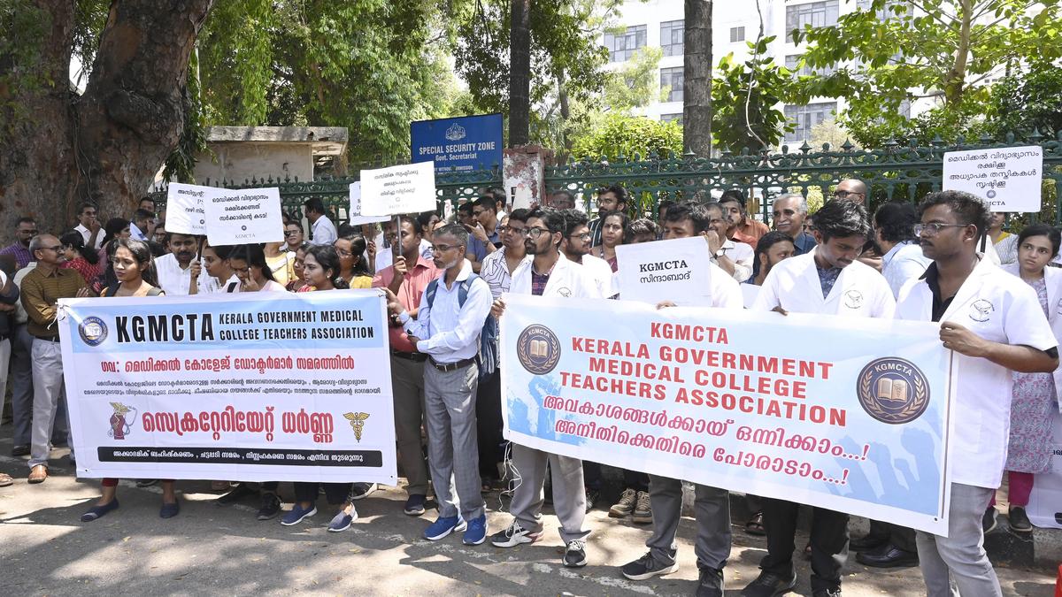 Doctors of Government Medical College Hospital, Thiruvananthapuram, under the aegis of the Kerala Government Medical College Teacher’s Association (KGMCTA), taking part in a protest in front of the Secretariat on Thursday against the alleged neglect shown by the State government towards their demands.