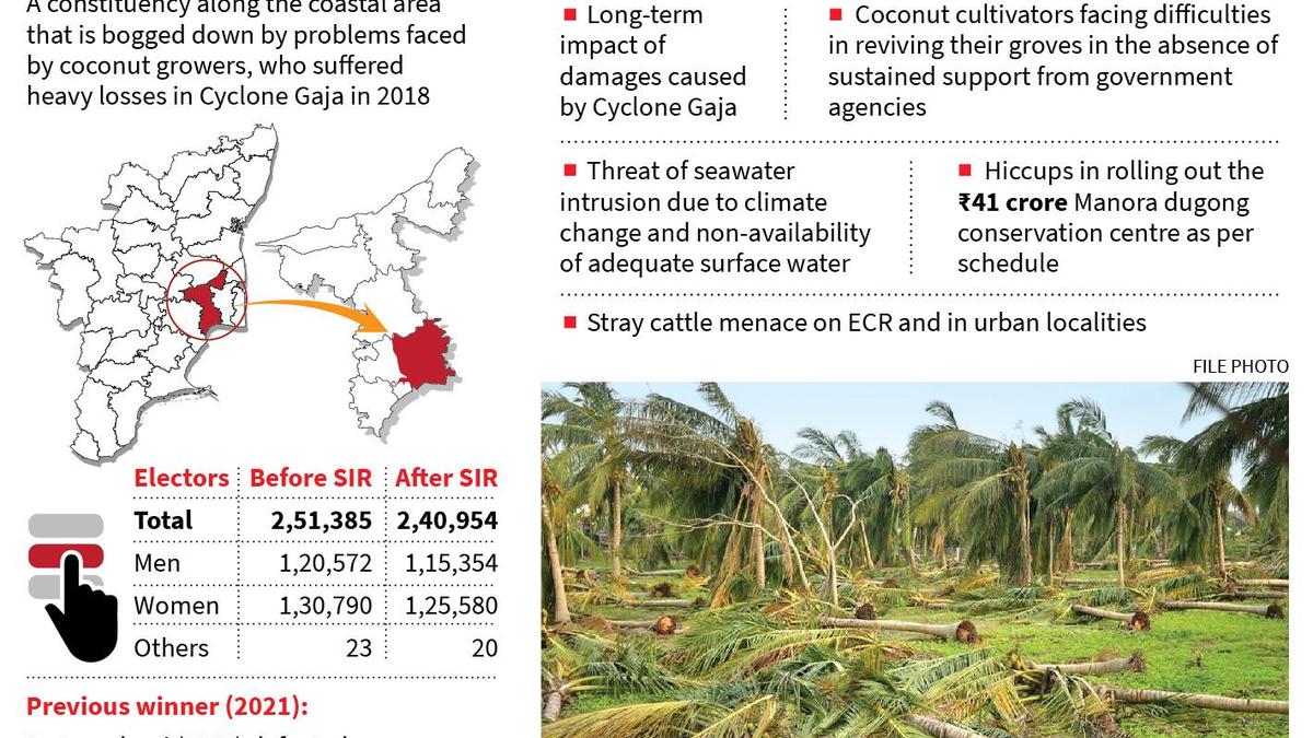 Idyllic and serene, the Pattukottai Assembly Constituency has been described as the coconut belt of the Cauvery delta region. Until some decades ago, paddy cultivation flourished in the region. It gradually gave way to coconut cultivation on large tracts of land due to the prolonged Cauvery water dispute and neglect of several water bodies. Though the Grand Anicut Canal served as the lifeline for irrigation, uncertainty over release of sufficient water through the canal had a telling effect on agriculture activity and, hence, farmers turned their eye towards coconut-growing. Published – April 14, 2026 05:50 pm IST Share this: Click to share on WhatsApp (Opens in new window) WhatsApp Click to share on Facebook (Opens in new window) Facebook Click to share on Threads (Opens in new window) Threads Click to share on X (Opens in new window) X Click to share on Telegram (Opens in new window) Telegram Click to share on LinkedIn (Opens in new window) LinkedIn Click to share on Pinterest (Opens in new window) Pinterest Click to email a link to a friend (Opens in new window) Email More Click to print (Opens in new window) Print Click to share on Reddit (Opens in new window) Reddit Click to share on Tumblr (Opens in new window) Tumblr Click to share on Pocket (Opens in new window) Pocket Click to share on Mastodon (Opens in new window) Mastodon Click to share on Nextdoor (Opens in new window) Nextdoor Click to share on Bluesky (Opens in new window) Bluesky Like this:Like Loading... Post navigation Tamil Nadu election: TVK’s Sulur candidate faints from exhaustion minutes after garlanding Vijay in coimbatore Ambedkar’s ideals must guide everyday life, RTI Commissioner tells Andhra University