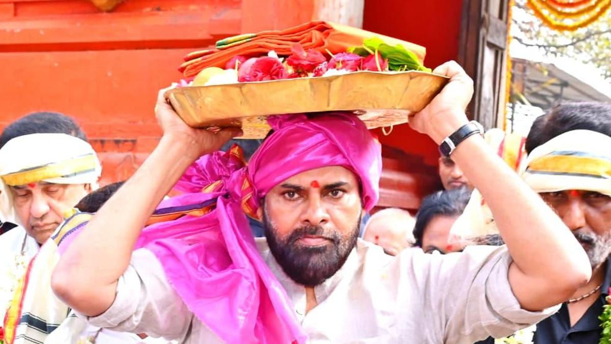 Andhra Pradesh Deputy Chief Minister K. Pawan Kalyan at the Sri Anjaneya Swamy temple, at Kondagattu of Jagtial district in Telangana on Saturday.