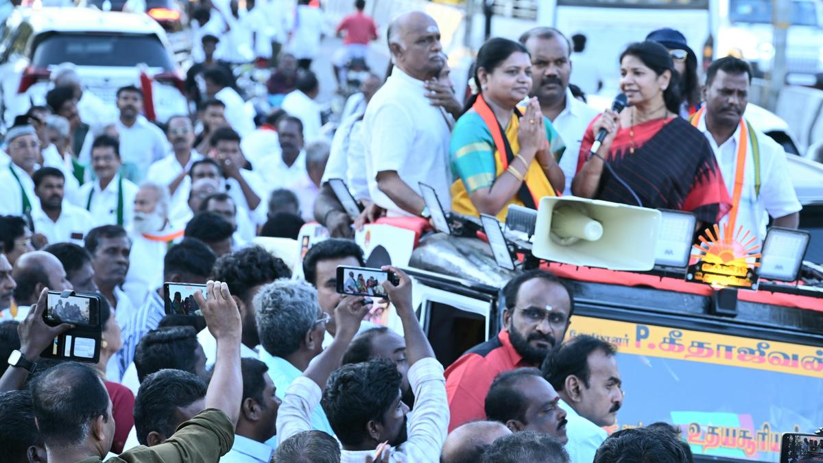 K. Kanimozhi, MP. addressing the election campaign for Thoothukudi Constituency DMK candidate P. Geetha Jeevan on Wednesday. | Photo Credit: RAJESH N Thoothukudi MP and Deputy General Secretary of DMK Kanimozhi Karunanidhi said that while people are not even turning back to look at the election manifestos of other parties, they are celebrating the DMK’s manifesto. Addressing the media, following the inauguration of the election office of Secular Progressive Alliance in Thoothukudi, she said that her campaign for the DMK would begin on Thursday at Keeladi, symbolising the culture and civilisation of Tamils. She added that Minister Geetha Jeevan, who has been announced as DMK candidate for Thoothukudi constituency, is capable of serving people effectively and has brought pride to the chief minister through her work. Ms. Kanimozhi further stated that the DMK government has functioned as a people-centric administration that uplifts women and enables youth to plan their future. It has also attracted various industrial investments and created employment opportunities. She highlighted that while people do not revisit election manifesto of other parties, the DMK’s manifesto is being celebrated because people trust that party will fulfil its promises. She expressed confidence that Chief Minister M. K. Stalin will form the government again and that further development will be brought to Thoothukudi. Ms. Kanimozhi also noted that while candidates are changed, differences of opinion and disappointment may arise, and alliance discussion may create controversies. However, she emphasised that all are united by ideology and will work together towards victory. On law and order, she stated that the percentage of cases registered in Tamil Nadu is lower than the national average. While not denying the occurrence of crimes, she said that swift action is taken to ensure justice for victims. Following the event Ms. Kanimozhi and Minister Geetha Jeevan paid floral tributes to the statue of late chief minister K. Karunanidhi. Ms Kanimozhi also launched the vehicle campaign of Ms. Geetha Jeevan. Published – April 01, 2026 08:51 pm IST Share this: Click to share on WhatsApp (Opens in new window) WhatsApp Click to share on Facebook (Opens in new window) Facebook Click to share on Threads (Opens in new window) Threads Click to share on X (Opens in new window) X Click to share on Telegram (Opens in new window) Telegram Click to share on LinkedIn (Opens in new window) LinkedIn Click to share on Pinterest (Opens in new window) Pinterest Click to email a link to a friend (Opens in new window) Email More Click to print (Opens in new window) Print Click to share on Reddit (Opens in new window) Reddit Click to share on Tumblr (Opens in new window) Tumblr Click to share on Pocket (Opens in new window) Pocket Click to share on Mastodon (Opens in new window) Mastodon Click to share on Nextdoor (Opens in new window) Nextdoor Click to share on Bluesky (Opens in new window) Bluesky Like this:Like Loading... Post navigation Cyberabad civic body reviews traffic bottlenecks, plans coordinated action with police More money was borrowed under BJP rule, claims Siddaramaiah