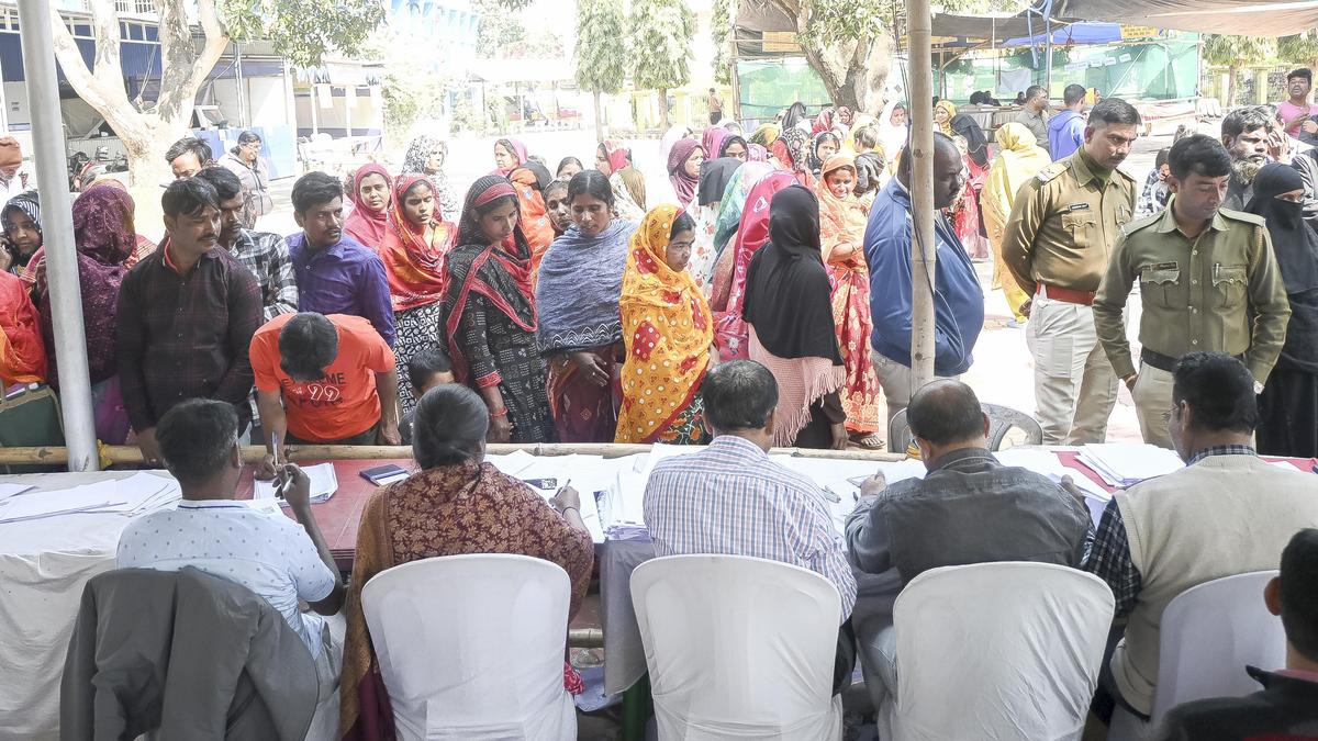 People wait in queues during hearings under the Special Intensive Revision of electoral rolls, at Krishnanagar, in Nadia, West Bengal, on Saturday, Feb. 7, 2026.