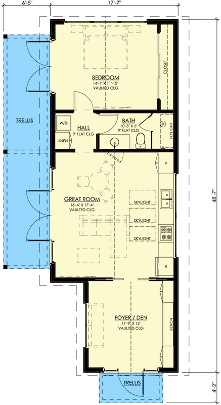 This contemporary single bedroom cottage house plan is an ideal starter home, vacation getaway cabin, or an ADU to generate income on your property. Enter the home through the foyer, which doubles as a den or lounge area, into the large open-concept kitchen and great room living space. Large picture windows and skylights combined with the vaulted ceilings throughout the home give this small space a larger than life feel. Architectural Designs’ primary focus is to make the process of…