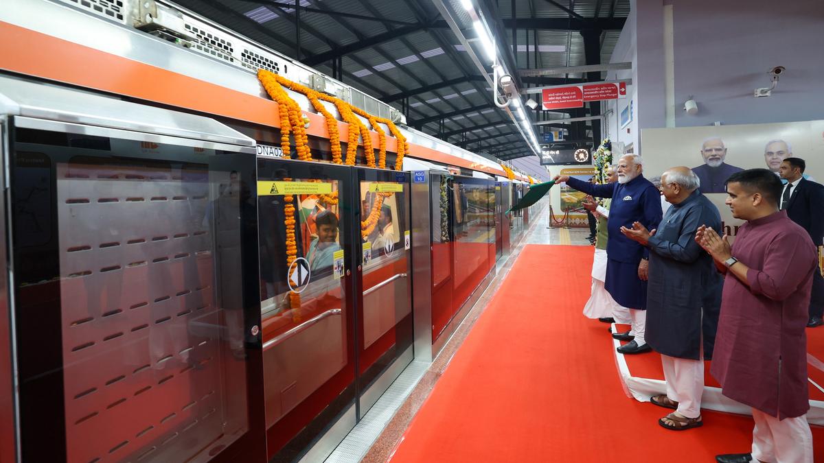 Prime Minister Narendra Modi flagging off the Metro Rail from the Mahatma Mandir Metro Station in Gandhinagar on Sunday. | Photo Credit: Special Arrangement Prime Minister Narendra Modi on Sunday (January 11, 2025) flagged off the Metro Rail from the Mahatma Mandir Metro station in Gandhinagar, marking the inauguration of the remaining Phase-II stretch of the Ahmedabad–Gandhinagar Metro project. Governor Acharya Devvrat, Chief Minister Bhupendra Patel and Deputy Chief Minister Harsh Sanghavi were present on the occasion. After flagging off the Metro service, the Prime Minister interacted with citizens gathered at the station. The station witnessed a festive and devotional atmosphere as people waved the national flag and raised slogans of “Jai Somnath, Jai Narendra Bhai ne Jai Somnath.” As part of the event, Mr. Patel and Mr. Sanghavi travelled by metro on the Phase-II route in Gandhinagar. During the journey, the Chief Minister interacted with commuters and students and sought feedback on the Metro services, reiterating the State government’s commitment to providing modern, efficient and fast public transport. Providing details of the project, Director (Project and Planning) of the Metro Rail, Anand Singh Bisht, said the Ahmedabad–Gandhinagar Metro Rail was first inaugurated in Ahmedabad in October 2022. In September 2024, the Prime Minister had inaugurated the Metro services from Motera to Sector-1, along with extensions up to Gujarat National Law University (GNLU) and GIFT City. With Sunday’s inauguration, the remaining Phase-II stretch comprising seven Metro stations over a distance of 7.8 km had become operational. Mr. Bisht said that during Phase-I, the Metro recorded an average daily ridership of around 35,000 passengers. With Phases I and II now fully integrated, daily ridership had increased to approximately 1.60 lakh passengers commuting between Ahmedabad and Gandhinagar, reflecting a rise of nearly 60%. Published – January 11, 2026 11:54 pm IST Share this: Click to share on WhatsApp (Opens in new window) WhatsApp Click to share on Facebook (Opens in new window) Facebook Click to share on Threads (Opens in new window) Threads Click to share on X (Opens in new window) X Click to share on Telegram (Opens in new window) Telegram Click to share on LinkedIn (Opens in new window) LinkedIn Click to share on Pinterest (Opens in new window) Pinterest Click to email a link to a friend (Opens in new window) Email More Click to print (Opens in new window) Print Click to share on Reddit (Opens in new window) Reddit Click to share on Tumblr (Opens in new window) Tumblr Click to share on Pocket (Opens in new window) Pocket Click to share on Mastodon (Opens in new window) Mastodon Click to share on Nextdoor (Opens in new window) Nextdoor Click to share on Bluesky (Opens in new window) Bluesky Like this:Like Loading... Post navigation Tata Steel Chess | Yip holds nerve in tie-breaker to win blitz title; So too emerges champion The year gone by, the Quad’s year of interregnum
