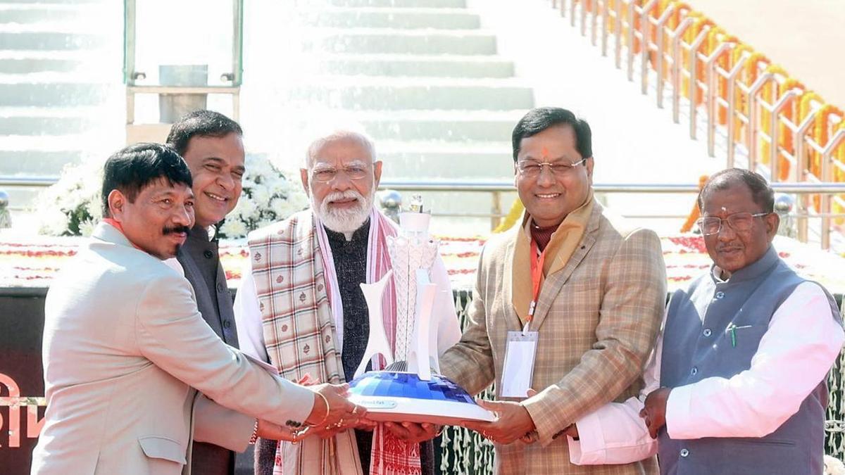 Prime Minister Narendra Modi was felicitated by Assam Governor Lakshman Prasad Acharya, Chief Minister Himanta Biswa Sarma, and Union Minister Sarbananda Sonowal during his visit to Swahid Smarak Kshetra at Paschim Boragaon, in Guwahati on December 2025. File
