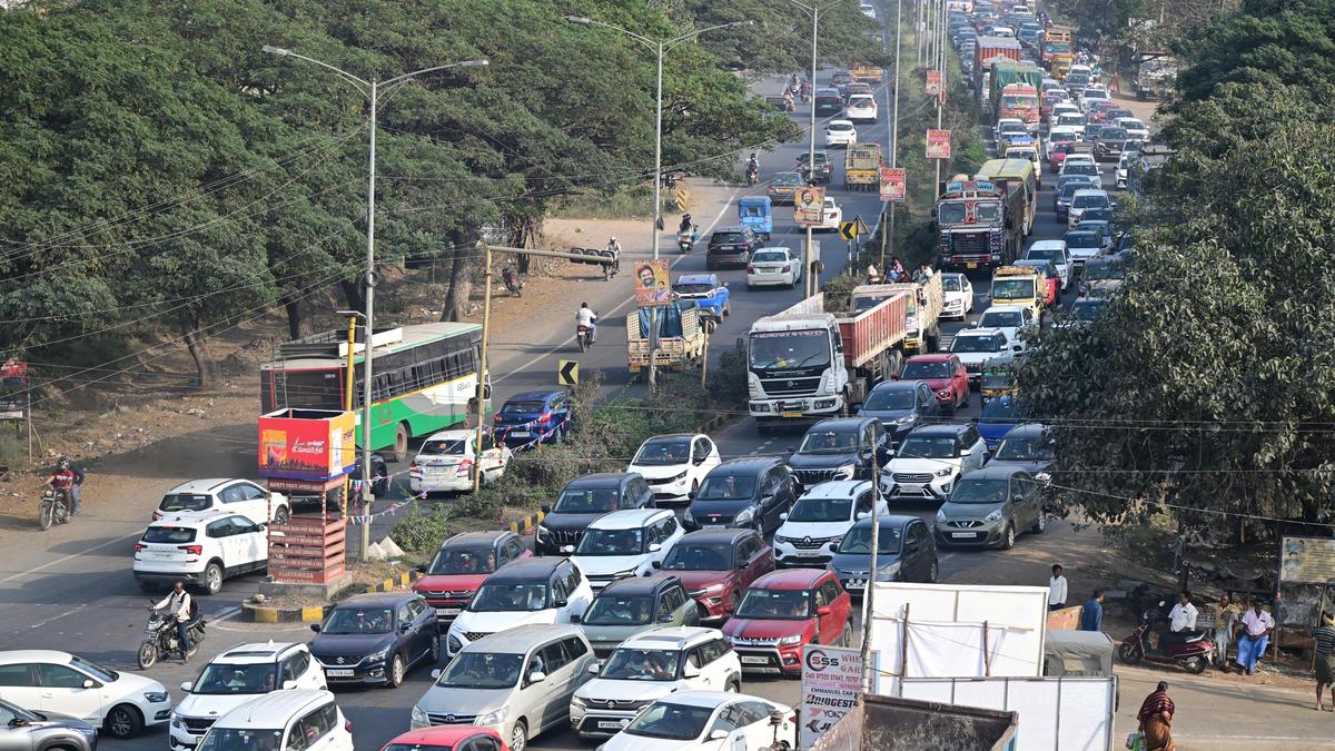 Long queues of cars, buses and other vehicles due to heavy traffic at the Vijayawada-Hyderabad national highway at Ibrahimpatnam and nearby stretches on Saturday. | Photo Credit: G.N. RAO Police diverted traffic on Saturday to prevent congestions on the national highways with people returning to workplaces at Chennai and Hyderabad following Sankranti festival. Traffic was moving slowly between Vijayawada-Chennai and Vijayawada-Hyderabad at Garikapadu, Kaza, Kalaparru and other toll gates as many private vehicles and travel buses queued up to go to Telangana and Tamil Nadu. Huge number of passengers were seen at the bus and railway stations due to the festive rush. Police arranged pickets and additional staff were deployed on the national highways and toll plazas to avoid traffic congestions. Published – January 17, 2026 07:53 pm IST Share this: Click to share on WhatsApp (Opens in new window) WhatsApp Click to share on Facebook (Opens in new window) Facebook Click to share on Threads (Opens in new window) Threads Click to share on X (Opens in new window) X Click to share on Telegram (Opens in new window) Telegram Click to share on LinkedIn (Opens in new window) LinkedIn Click to share on Pinterest (Opens in new window) Pinterest Click to email a link to a friend (Opens in new window) Email More Click to print (Opens in new window) Print Click to share on Reddit (Opens in new window) Reddit Click to share on Tumblr (Opens in new window) Tumblr Click to share on Pocket (Opens in new window) Pocket Click to share on Mastodon (Opens in new window) Mastodon Click to share on Nextdoor (Opens in new window) Nextdoor Click to share on Bluesky (Opens in new window) Bluesky Like this:Like Loading... Post navigation Two siblings arrested for ‘murder’ of their brother Telangana doctor appointed as FAIMA Acting President